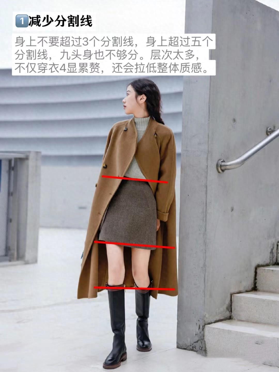 我們應該秉承着全身分割線不超過3個的原則,如果分割線太多,不僅會顯得個子不夠高挑、還會有一種拖沓感,影響整體質感。減少身體分割線,纔是保持美麗的關鍵。