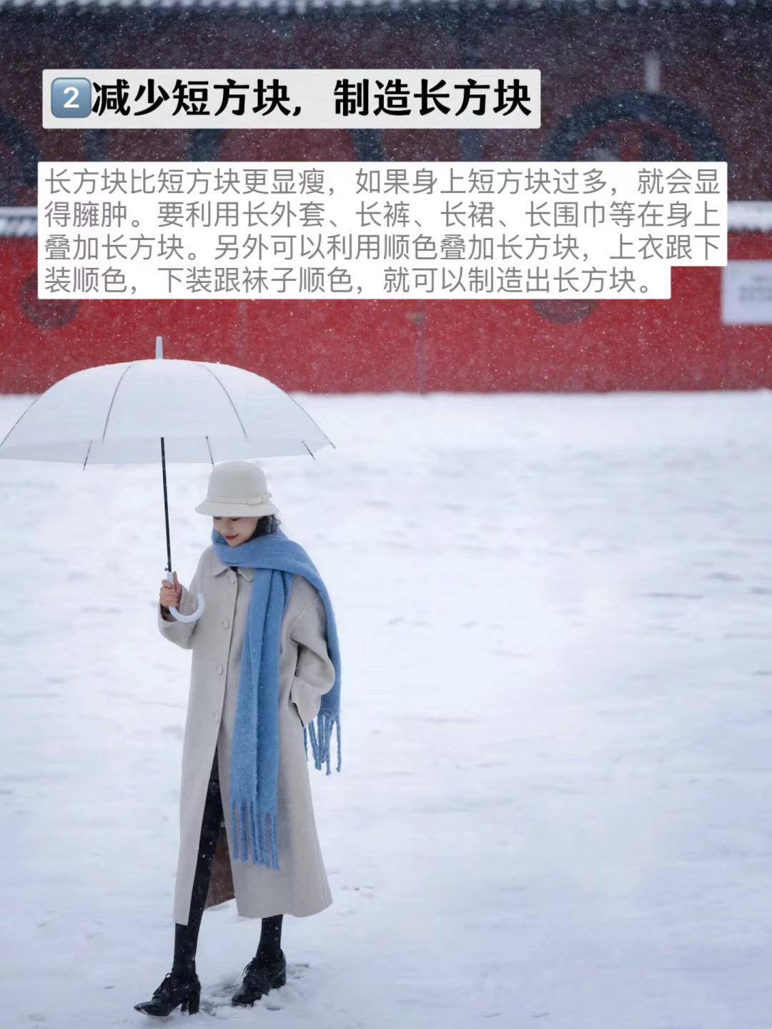 想要知道長方塊,我們可以多利用長款的外套、長圍巾、長裙、長褲等單品。同時運用順色的搭配,製造出線條上的延伸感,就會更加顯高顯瘦。