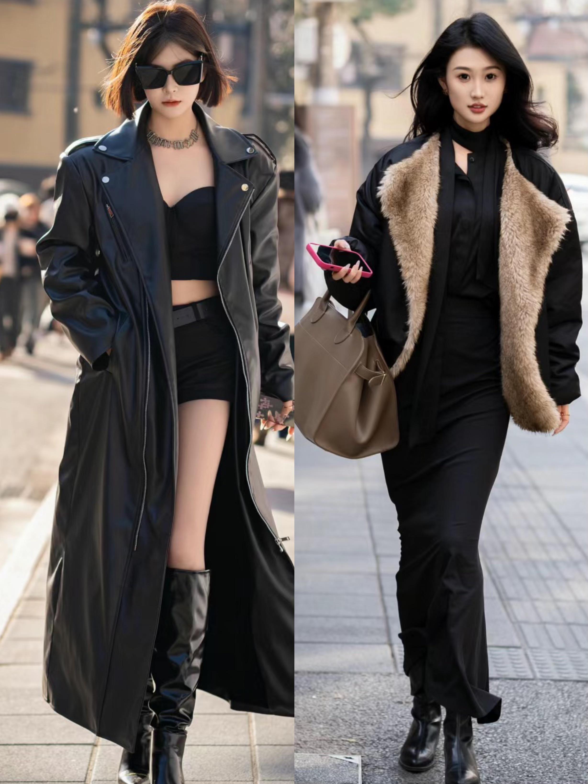 看上海街拍就明白,時髦精都更加偏愛黑色系。黑色的長大衣、黑色的半身裙、黑色的長靴、黑色的墨鏡,都可以成爲凹造型的單品。