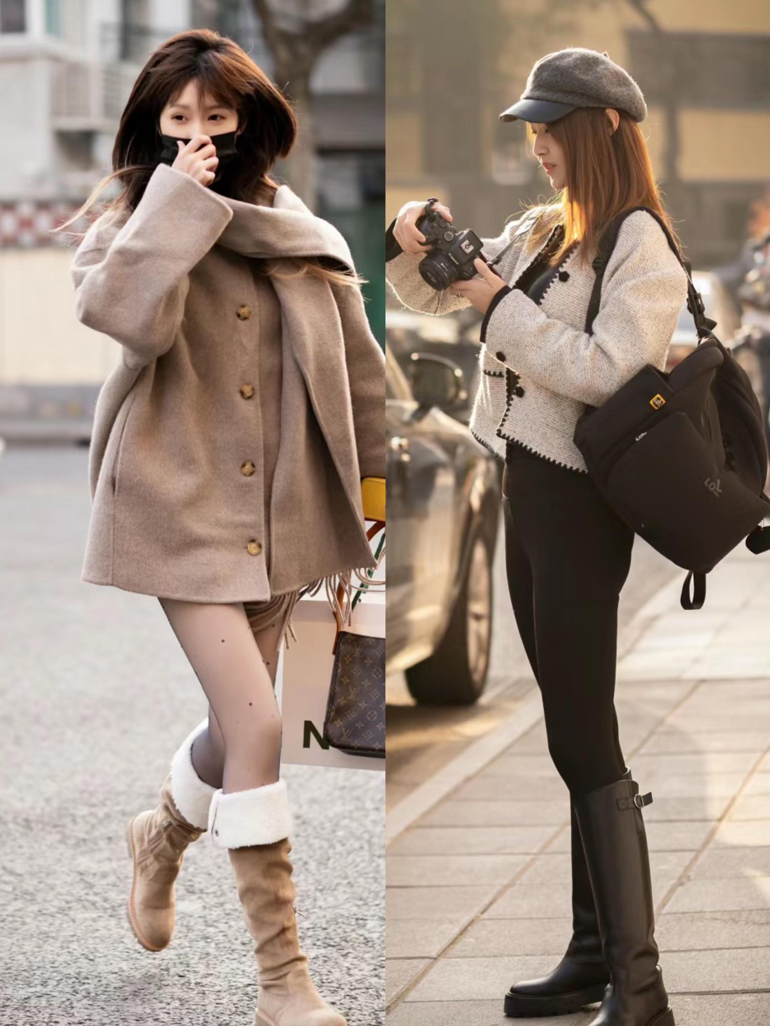 黑色針織連衣裙,配上稍微寬鬆的駝色大衣,溫柔又大方。黑色針織連衣裙作爲內搭,擁有更加溫柔大氣的美,配厚底的雪地靴搭配堆堆襪也很洋氣。
