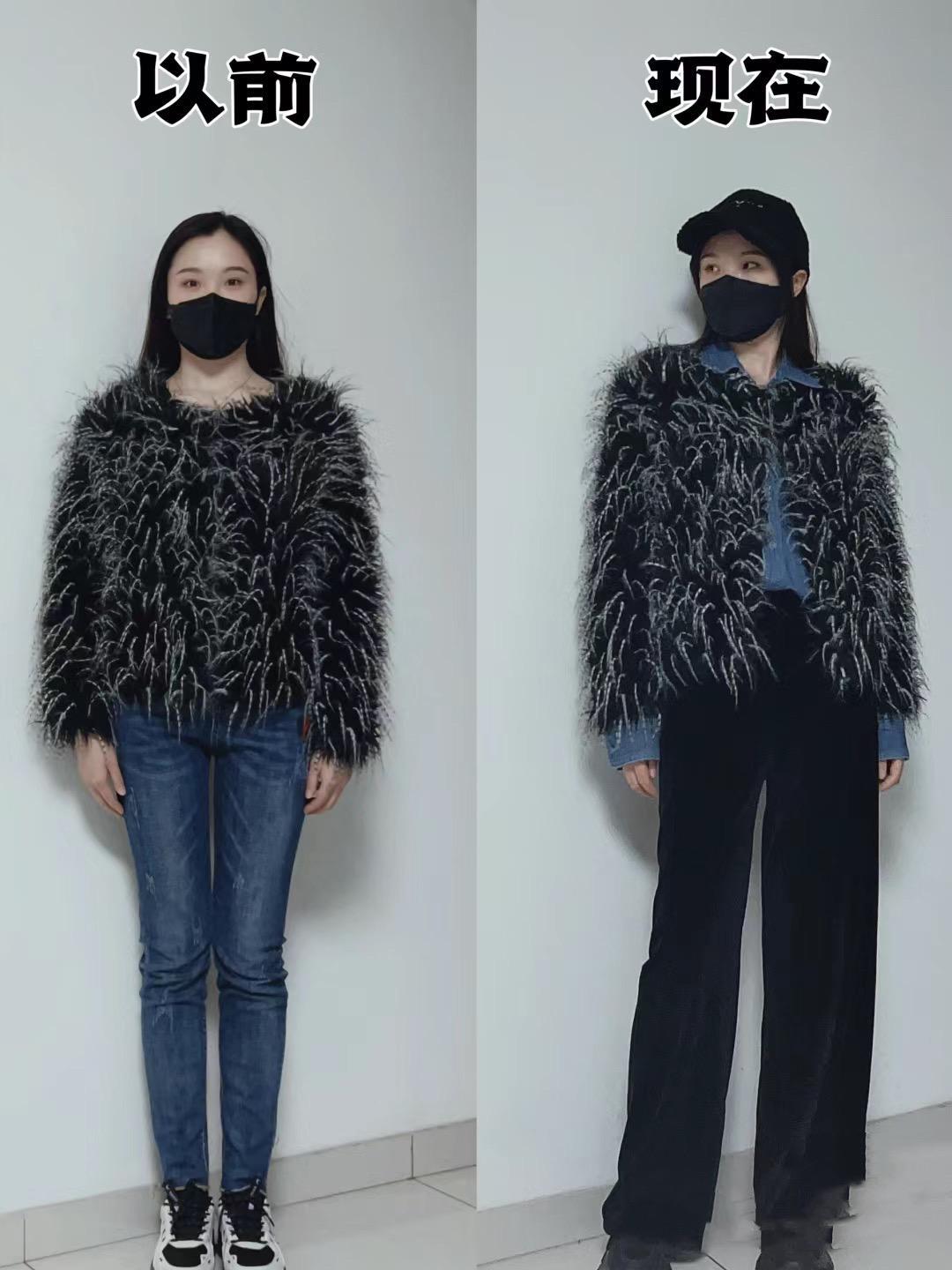 短款的皮草外套,可以搭配牛仔襯衫,層次分明又耐看。我們可以配高腰的黑色直筒褲,塑造出一種大長腿的效果。黑色直筒褲寬鬆的褲筒,顯得雙腿更修長了。