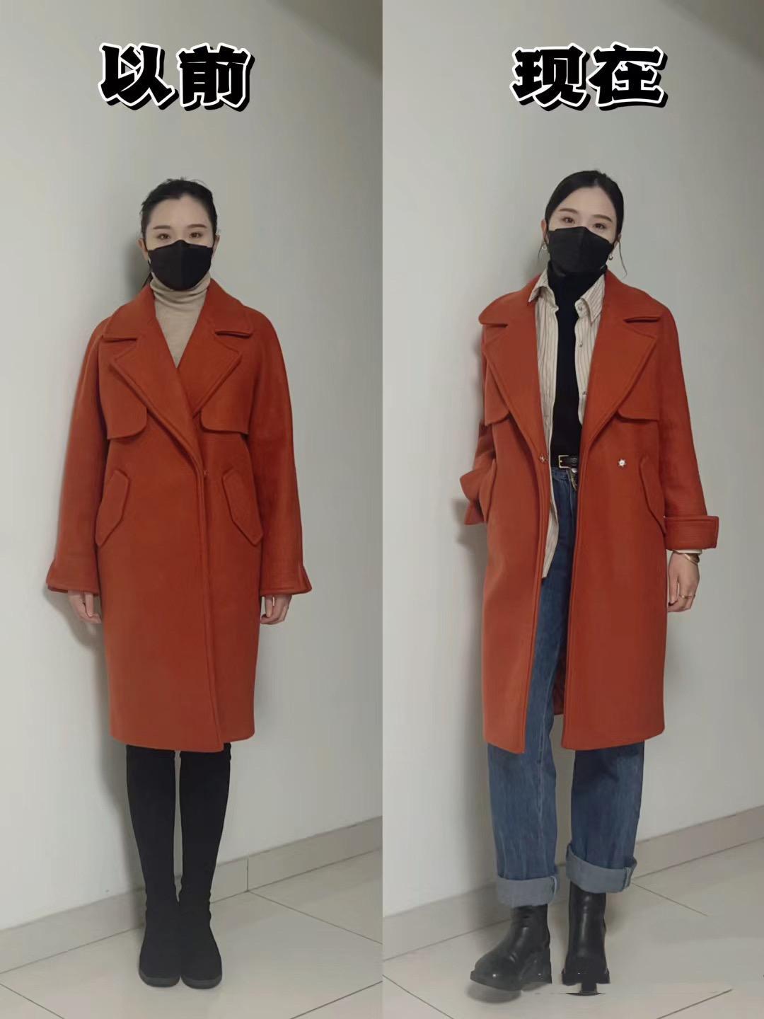 以前的磚紅色大衣,在過年的時候也可以拿出來凹造型。其實磚紅色是一種不挑人的顏色,穿起來顯白又提氣色,款式比較老氣的話,只需要注重搭配就對了。