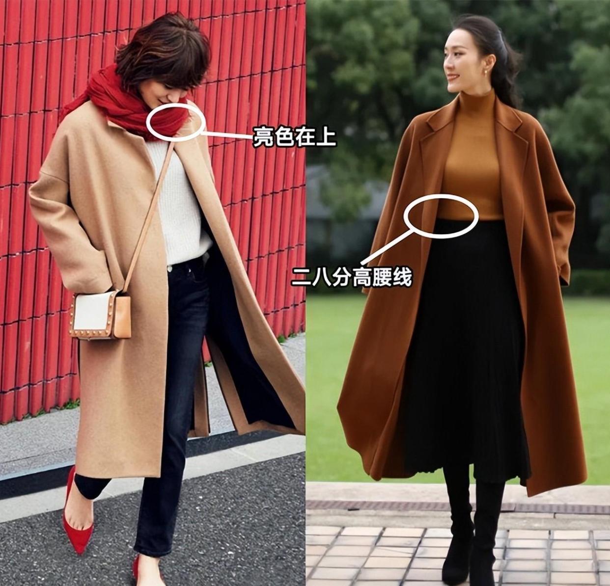 我們穿一件雙面呢的大衣,應該儘量搭配比較垂墜的面料,線條感垂墜不僅利落顯高、也會更加的高級顯氣質。