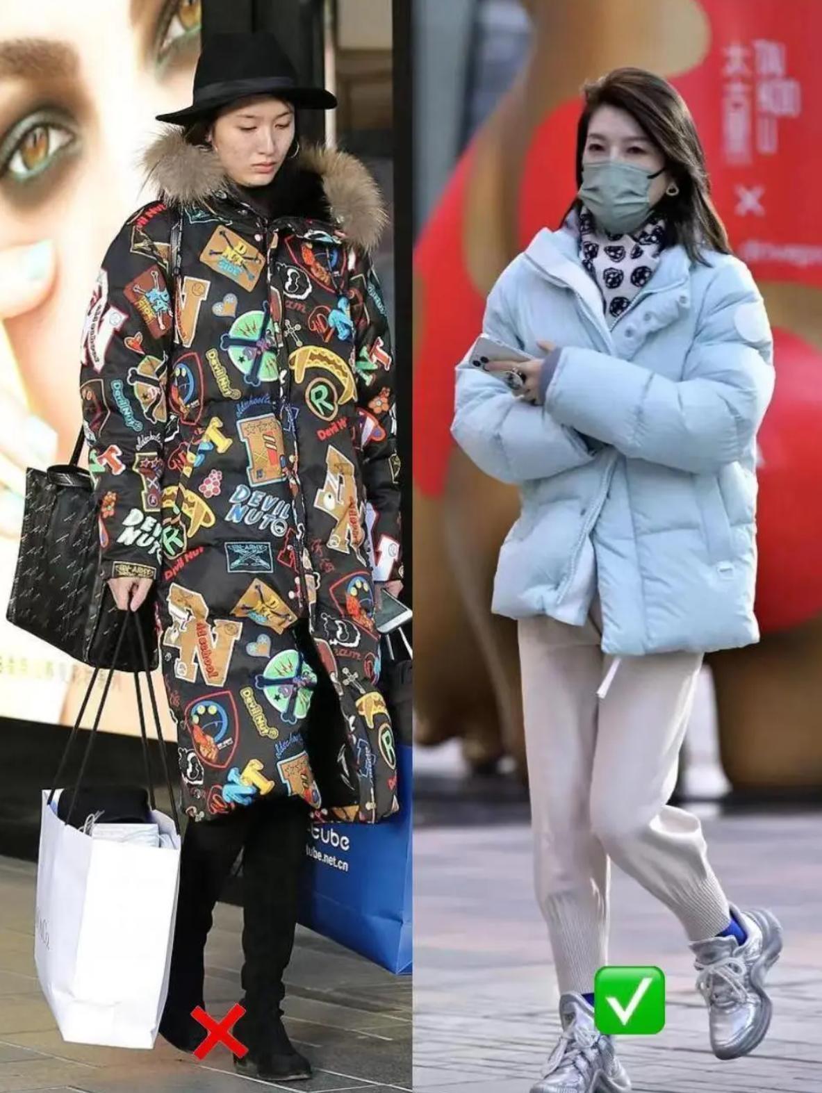 適當的印花,會增強青春感、表現出時尚的氛圍。但是大面積的印花就很容易顯得土氣邋遢,比如全身滿印的羽絨服,就給人一種廉價土氣感。
