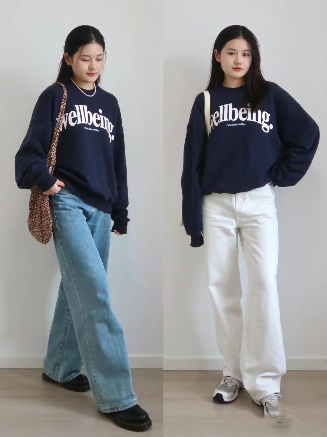 用字母印花的衛衣來搭配闊腿的牛仔褲,稍微塞一個衣角,就可以表現出更利落的效果。高腰的闊腿牛仔褲,會更加適合梨型身材、以及雙腿粗壯、腰腹部肥厚的人羣。