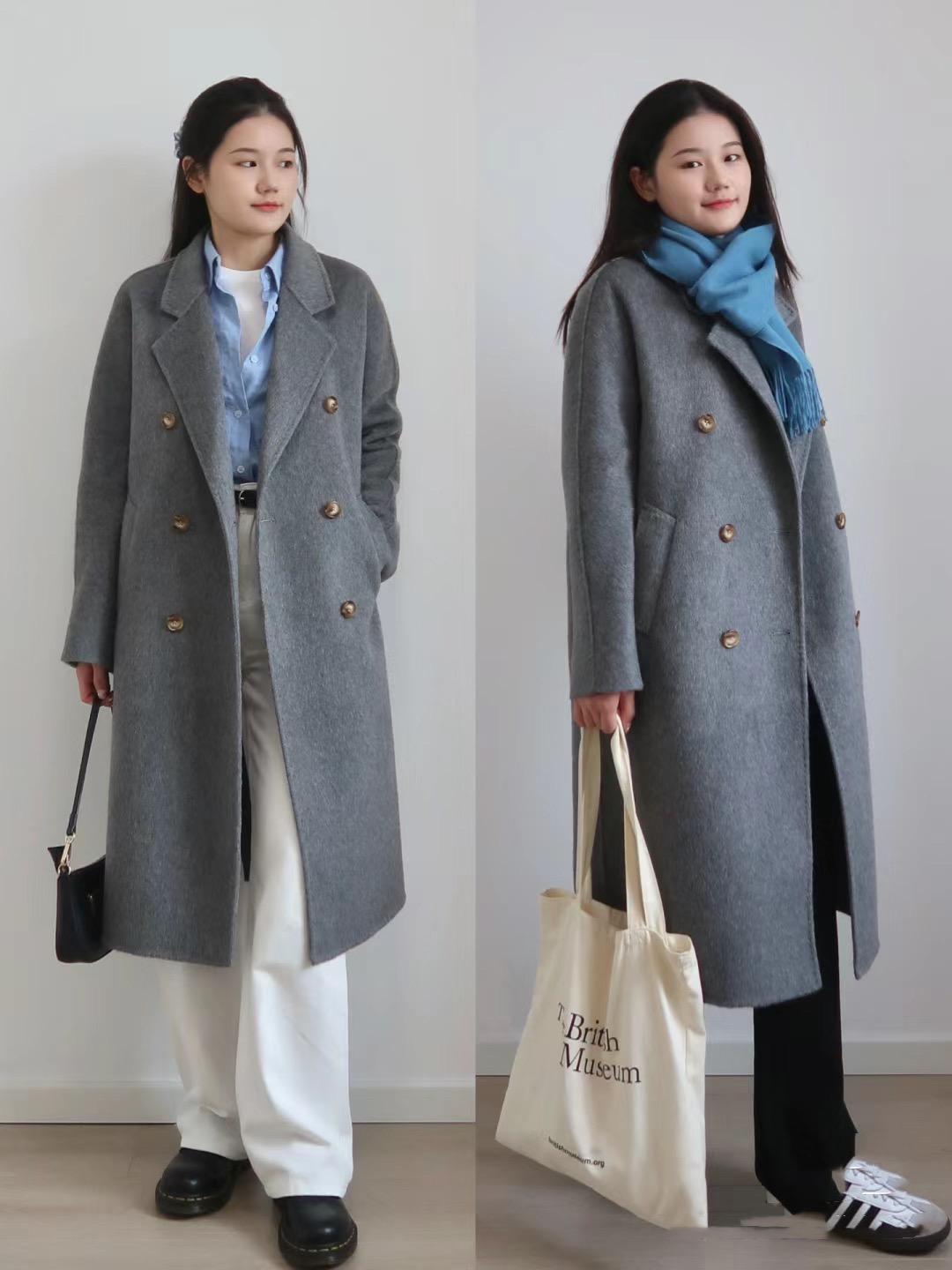 長款的灰色大衣,雙排扣的設計大方又耐看。不管是通勤風、還是知識分子風,都可以用清冷的灰色長大衣來凹造型。