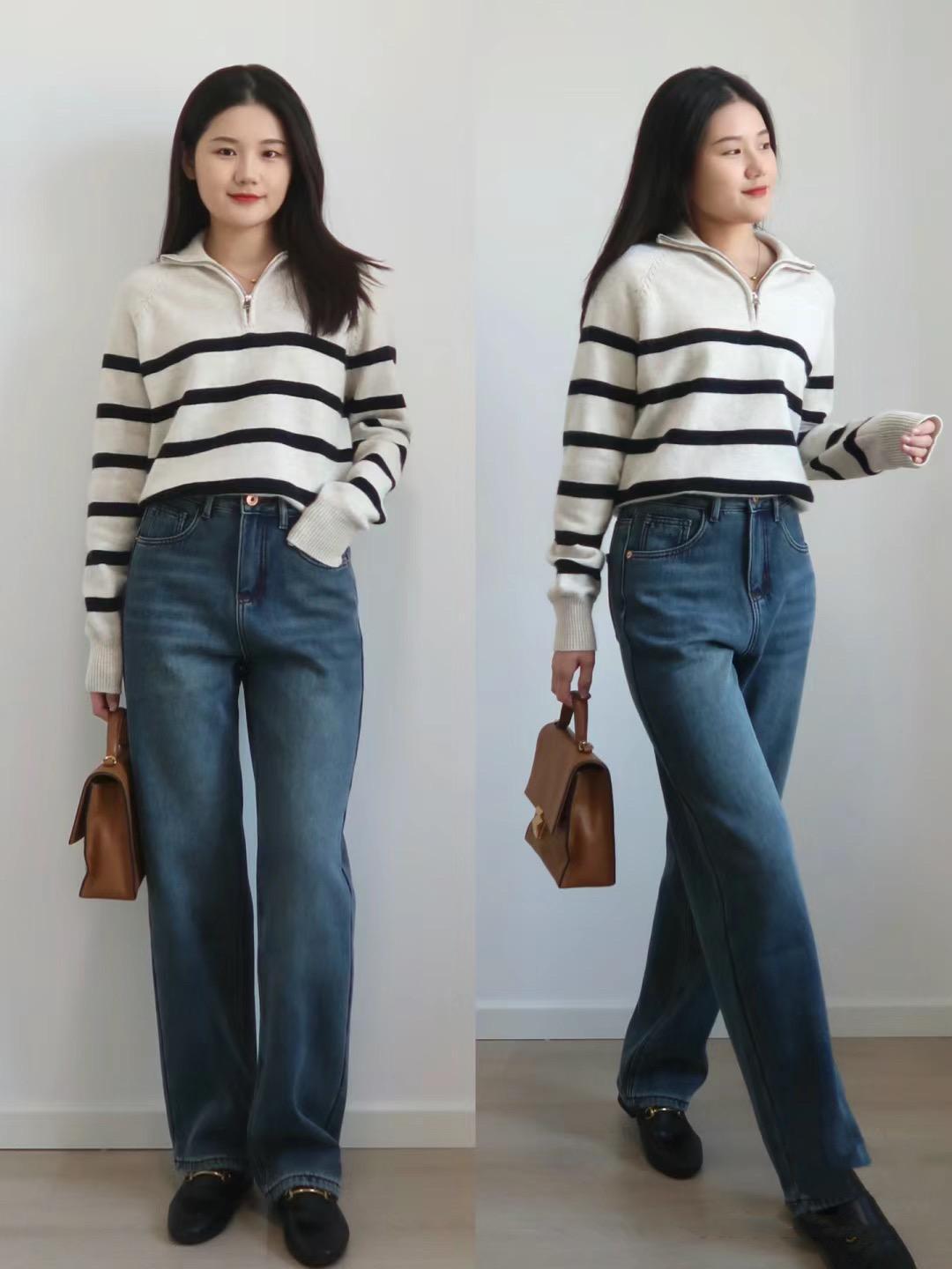 比如經典的半高領針織衫,利用了條紋元素以及半拉鍊的設計,又格外的耐看又很顯氣質。像這種基礎的半拉鍊條紋針織衫,配一條直筒的牛仔褲,大方又顯腿長。