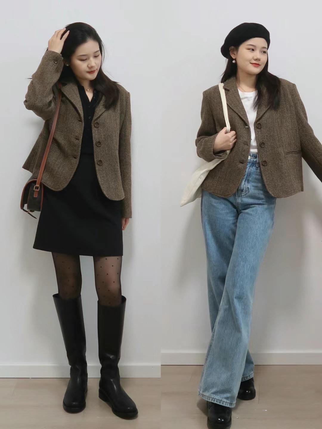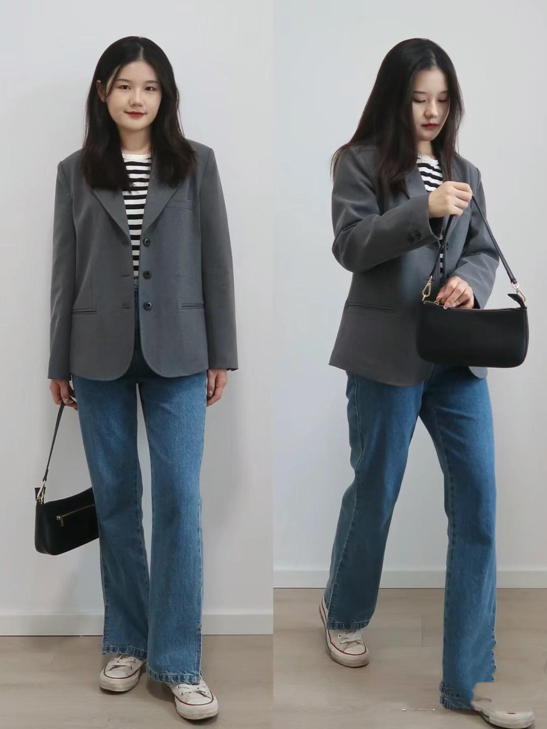 1、短款的西服外套+條紋打底衫+直筒的牛仔褲