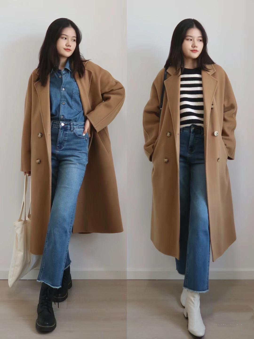駝色大衣+牛仔襯衫+九分牛仔褲