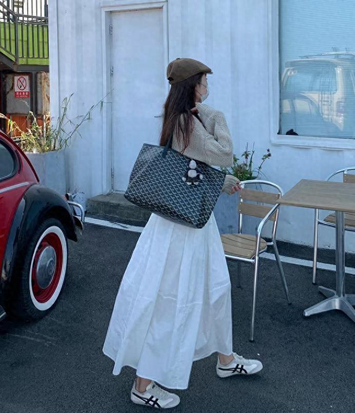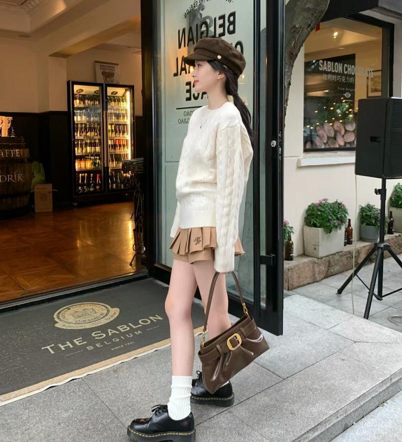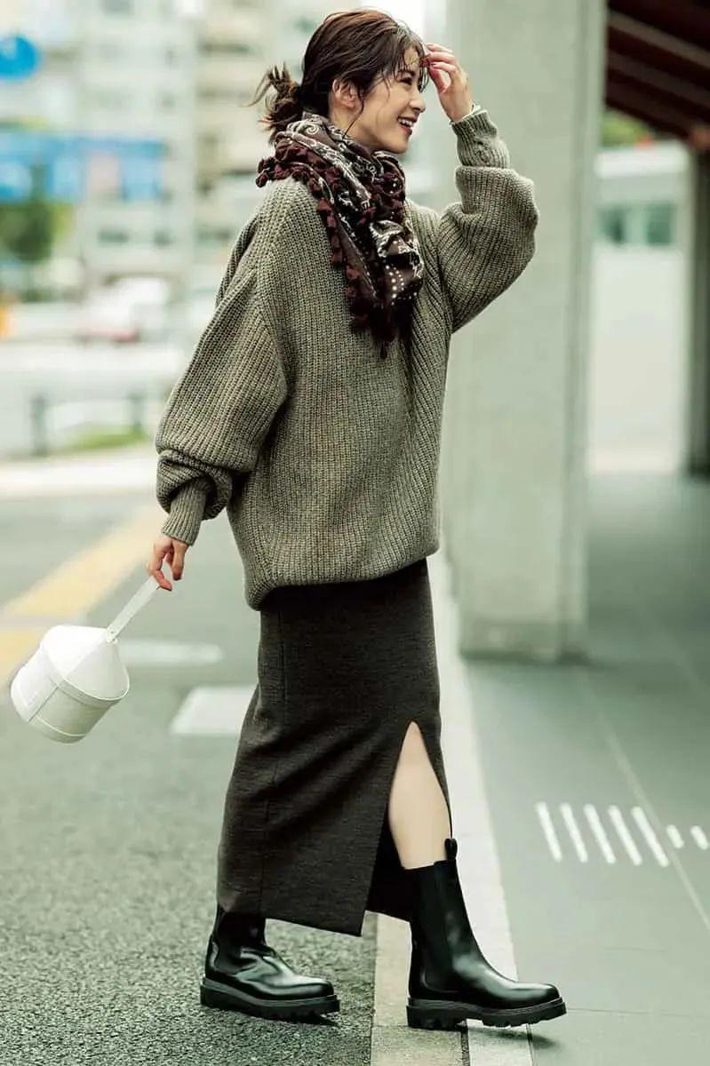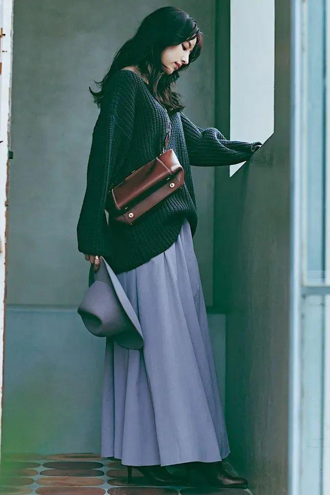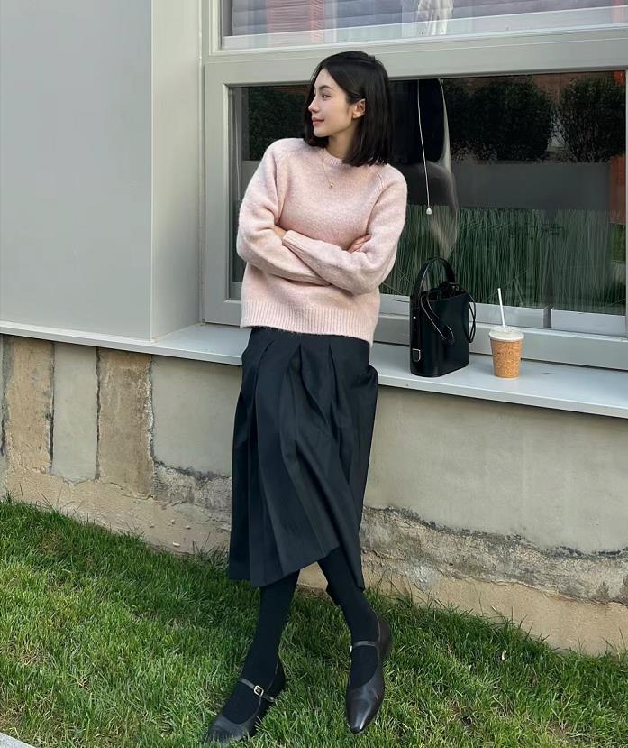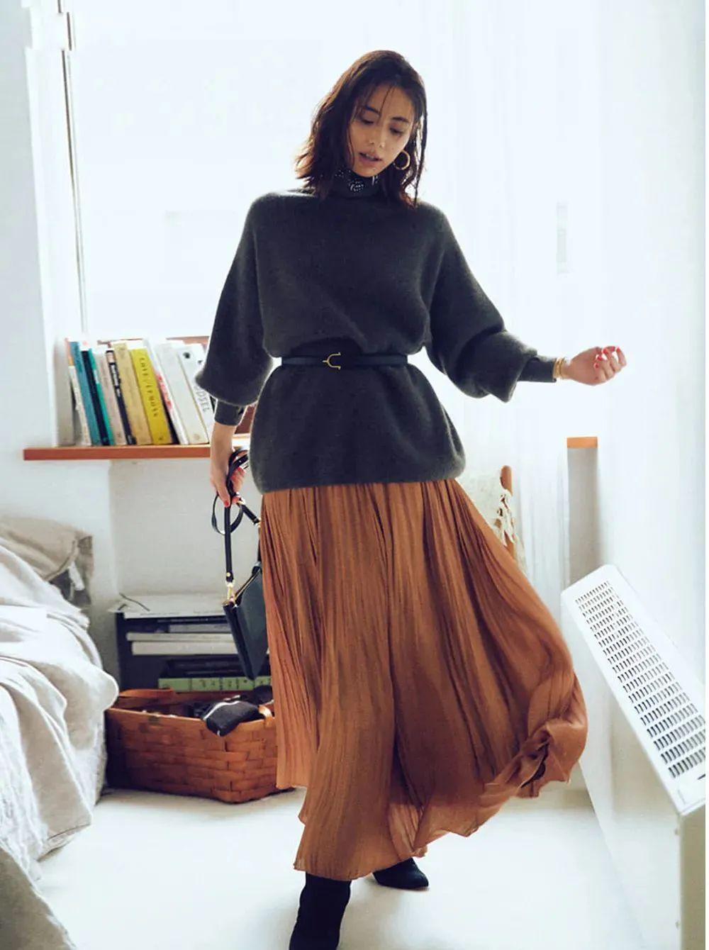 不管是單穿,還是疊穿各種外套都可以,記得要將毛衣的下襬塞點進裙子裏面,提高腰線比例,還能顯得乾淨利落。