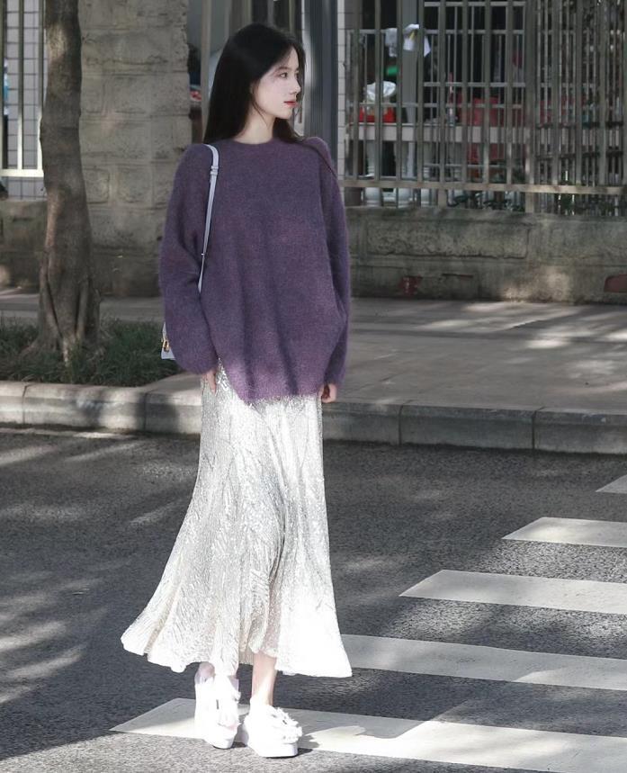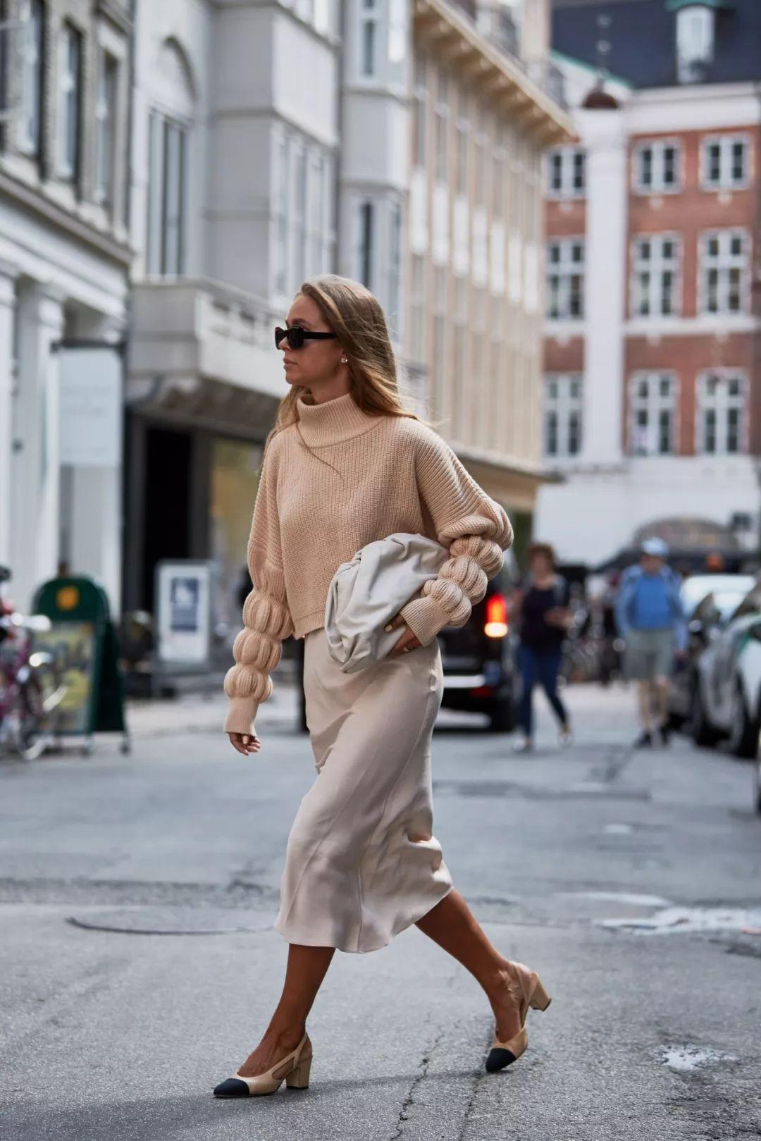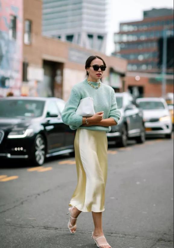 寬鬆毛衣+緞面半裙,這麼一套就是自帶高級感,裙子的質感和垂墜感也是極佳的。慵懶性感中還帶着幾分華麗,同色系的搭配,上下色彩呼應,整體看起來就更和諧了。