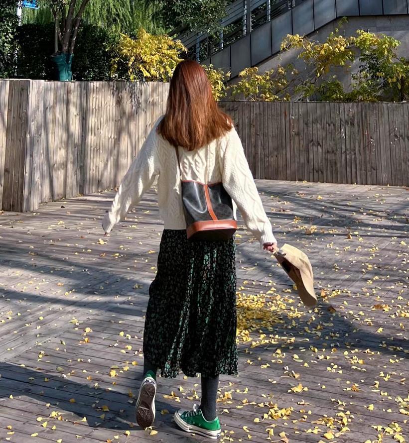 寬鬆一點的毛衣,穿起來才更休閒舒適,結合印花半裙,又多了幾分俏皮靈氣,注意印花元素不要太明豔,簡繁結合就行。