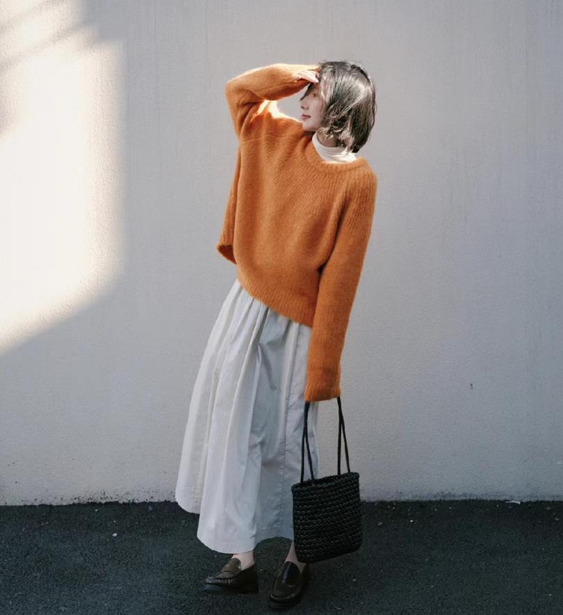 2024年的新年穿搭,這簡直就是行走的大吉大利,好喜歡這件橙色毛衣,基礎款,簡單大方又百搭。內搭白色打底,疊穿的組合,顯層次又保暖。