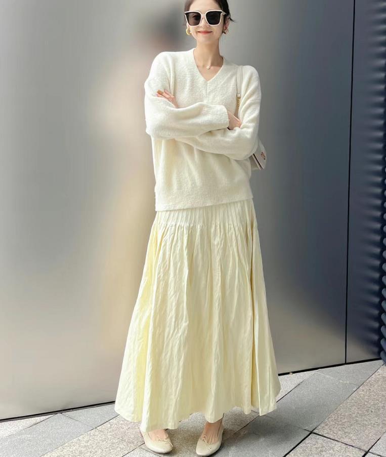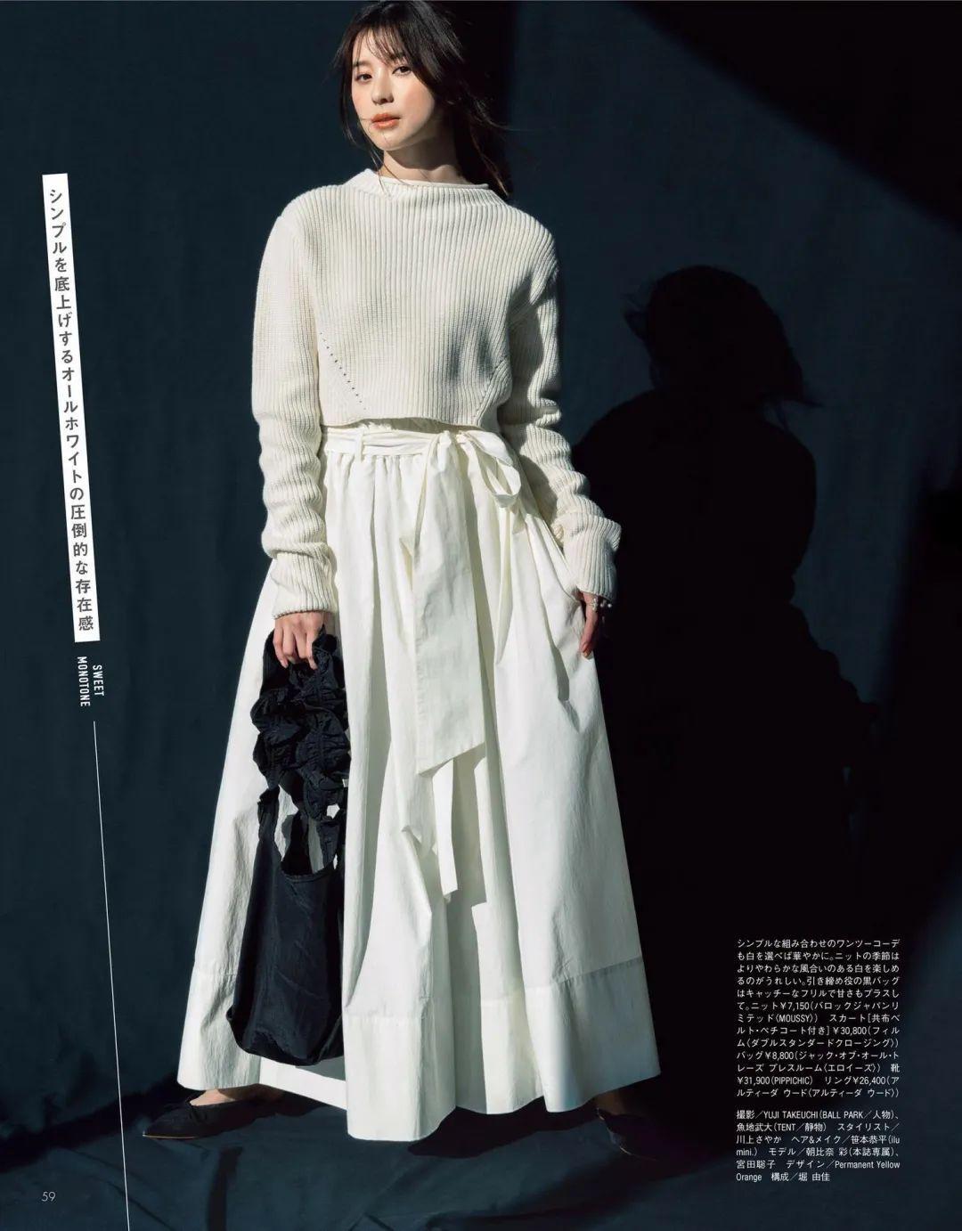 白色毛衣+皺褶半裙,顏色一致,但有一定的色差,組合在一起照樣是很顯層次的,完全不用擔心會顯單調。簡單又大氣。