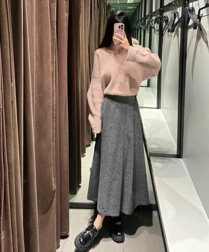 毛呢材質的半裙,保暖舒適又非常有質感,寬鬆的毛衣,讓你穿得舒適自在。早春還有些寒意,這麼一套整合適。