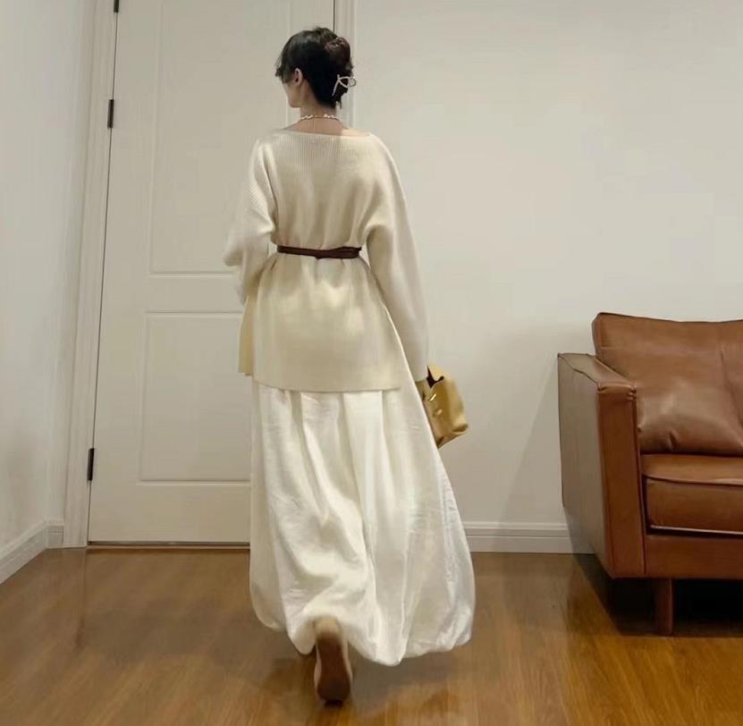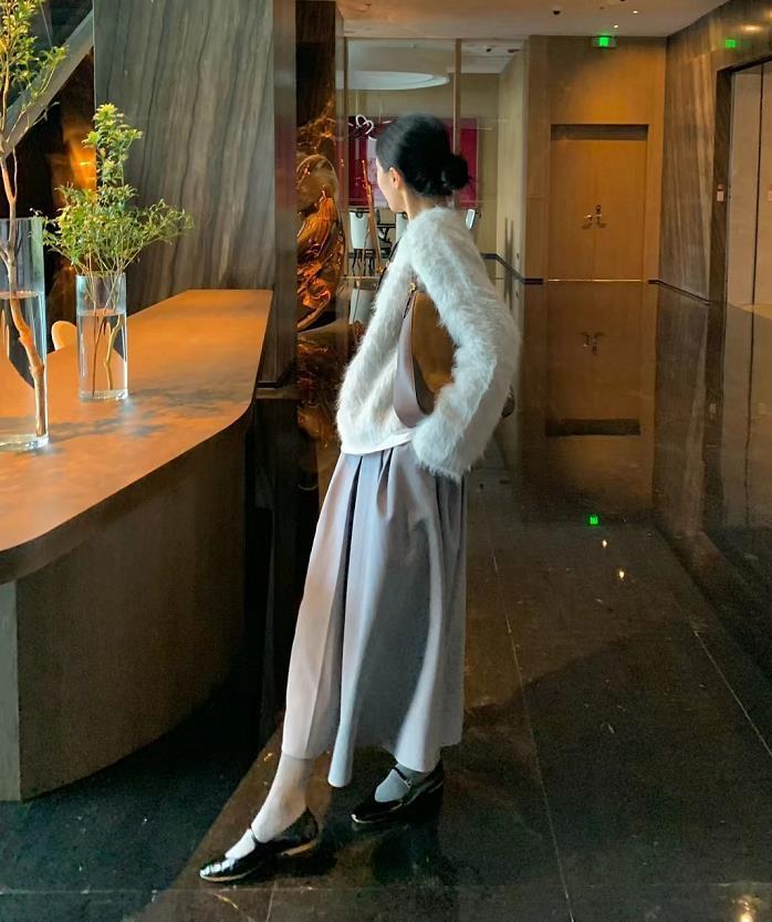毛衣+裙子的搭配,是真的很適合過年的一套,裙子款式可以選緞面裙,自帶高級感,而且它的垂墜感也是極佳的。