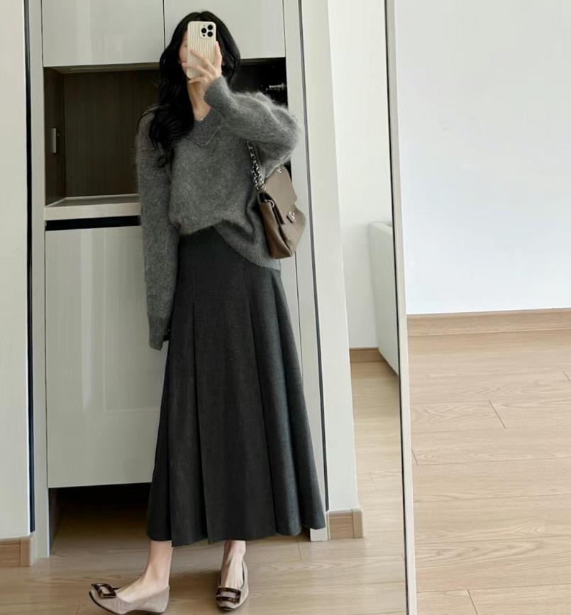 韓系風滿滿的一套,灰色v領毛衣,雖然很基礎簡約,但卻能穿得很高級。簡簡單單的款式,與深灰色百褶裙組合,優雅氣質且顯瘦。
