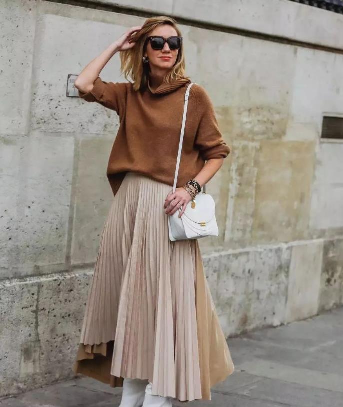 高領的毛衣,穿起來就更加能護住你頸部的溫度,出門連圍巾都可以省下了,當高領毛衣和裙子組合在一起後,就變得很氣質慵懶了。
