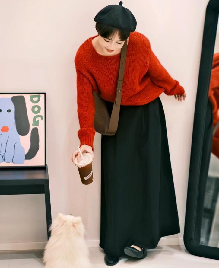 紅黑的配色組合,自帶高級感呢,很顯基礎的紅色毛衣,寬鬆的版型自帶慵懶隨性。短款長度,最適合個矮的身材了,搭配黑色半身長裙,也太顯瘦了吧。