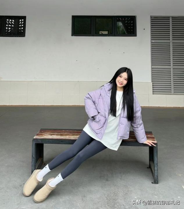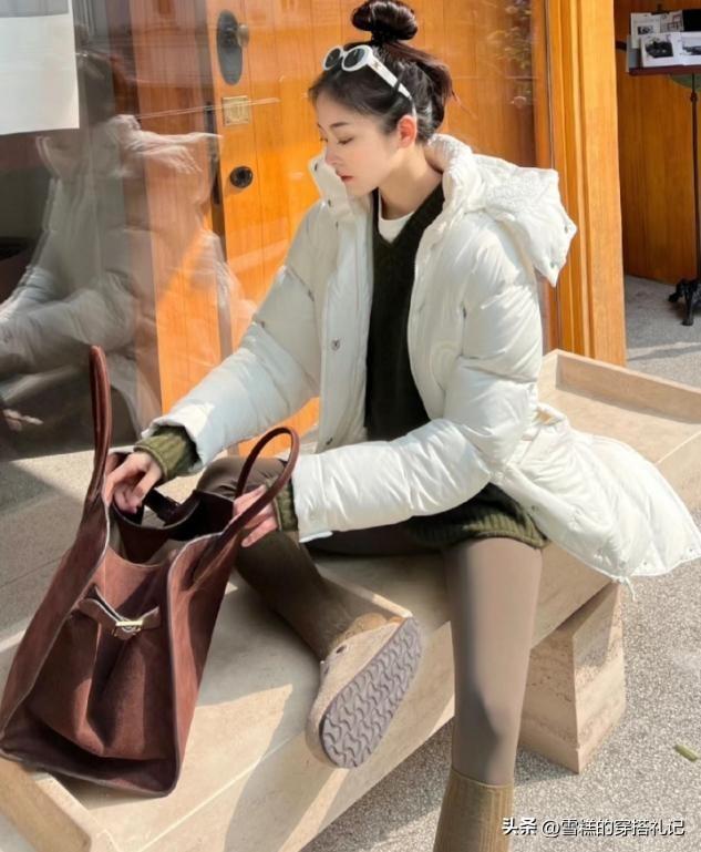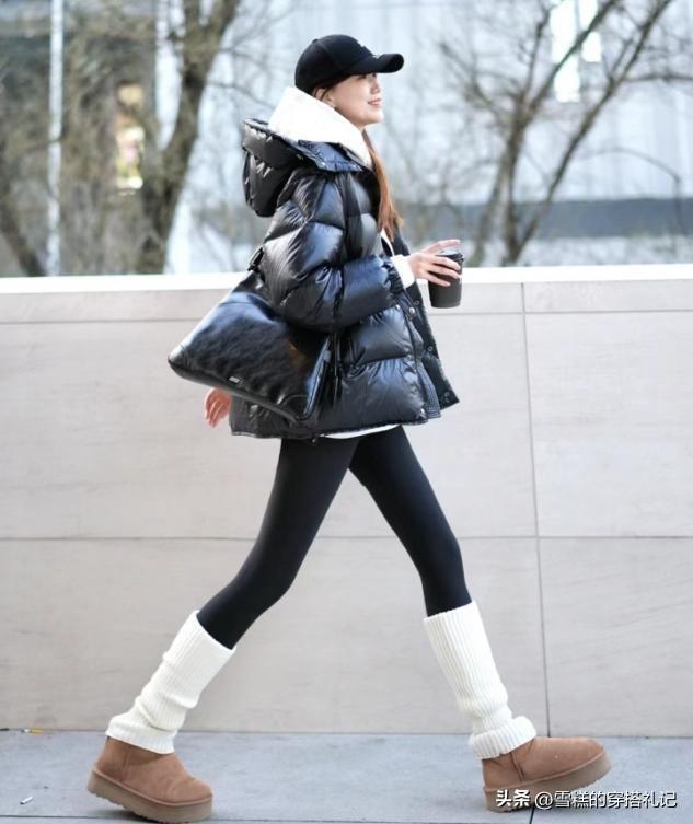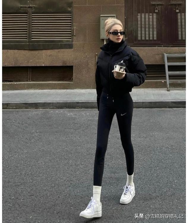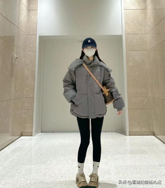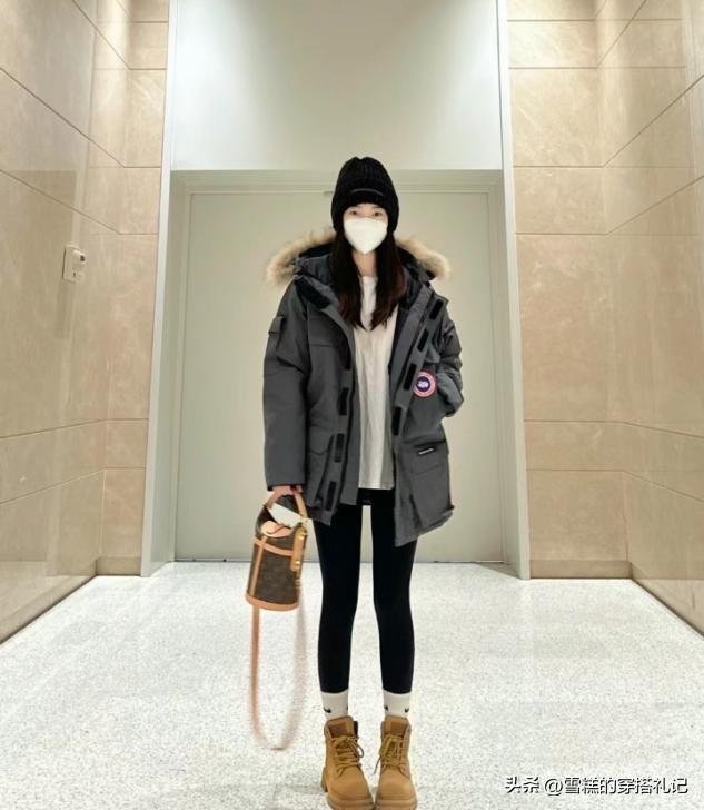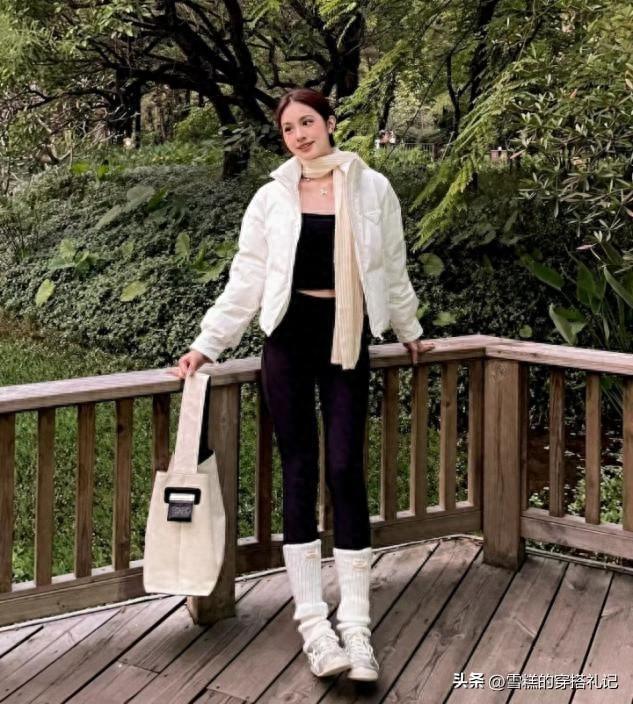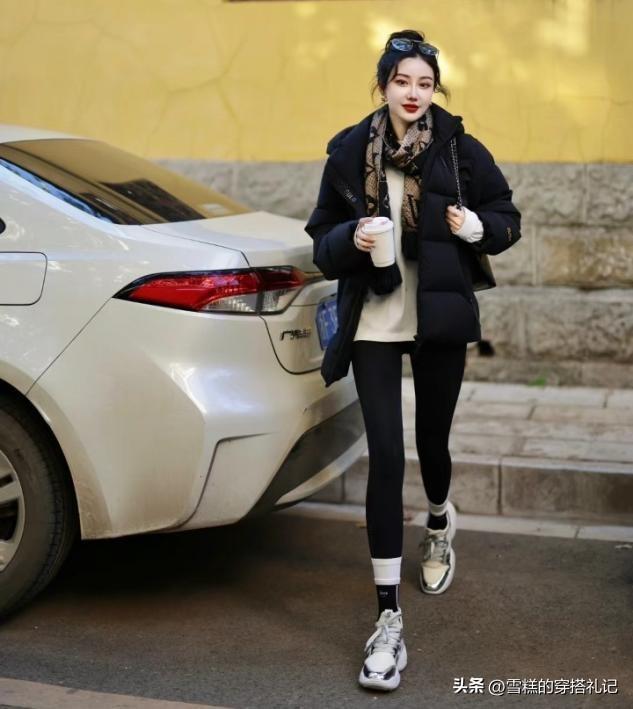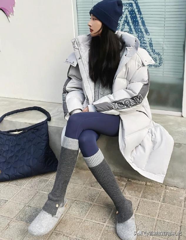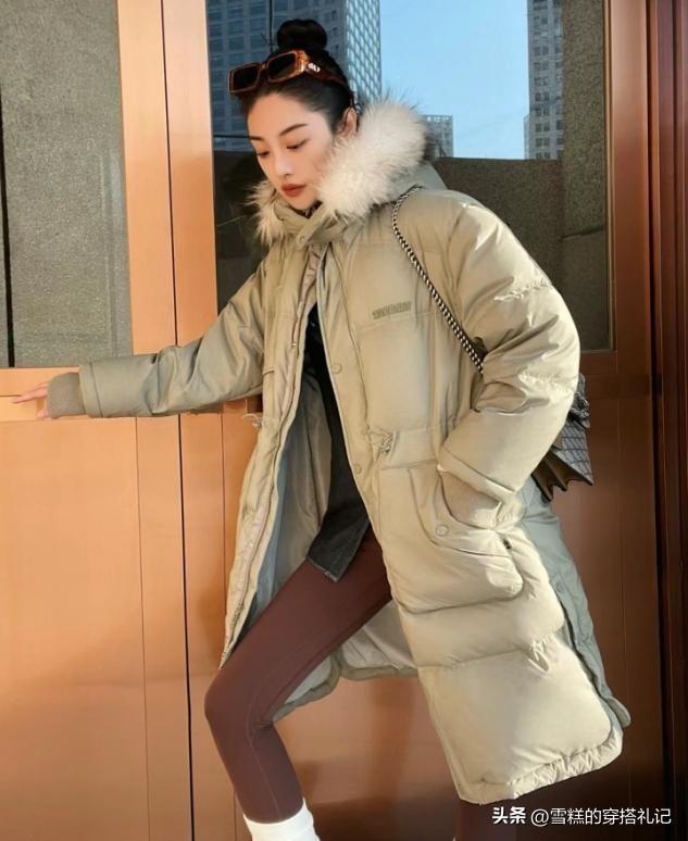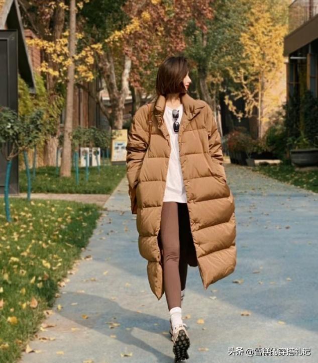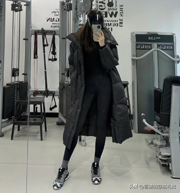 爲了恰好去降低穿衣的厚重感,瑜伽褲可以凸顯出縮減衣物膨脹的優勢,羽絨服過膝的穿法可以敞開,內搭的上衣塞衣角,上短下長的曲線設置的非常到位,造型顯高又顯瘦。