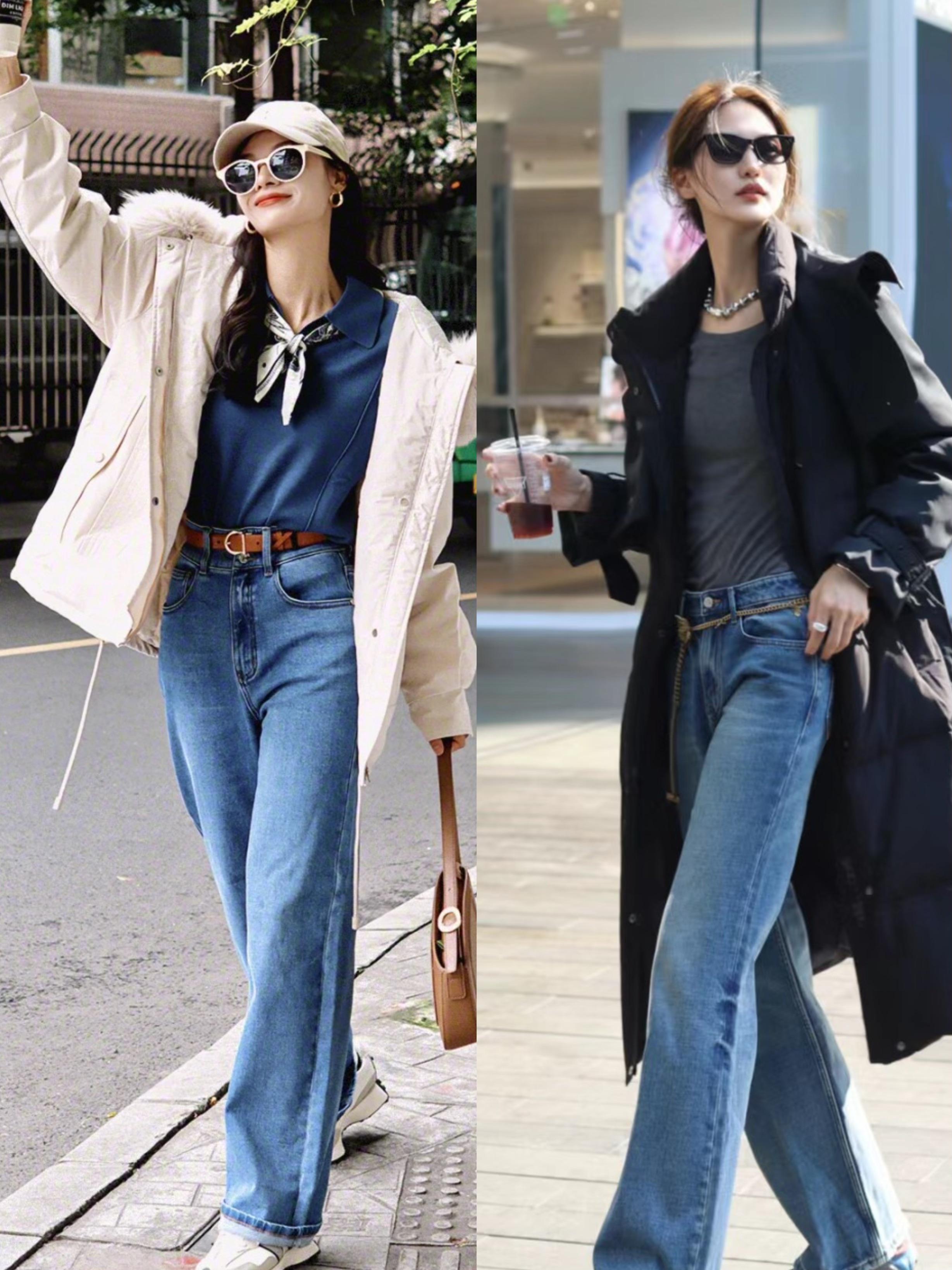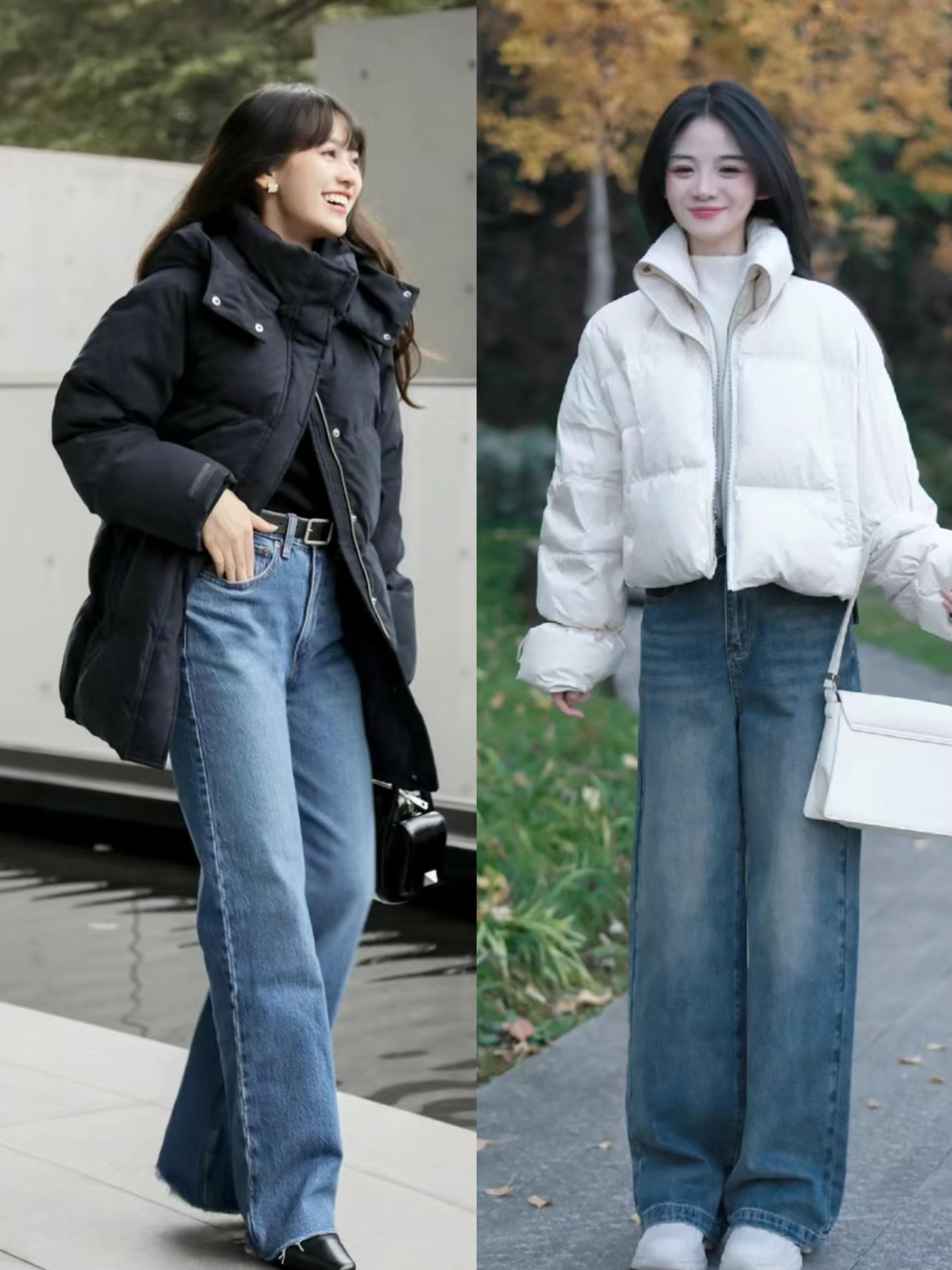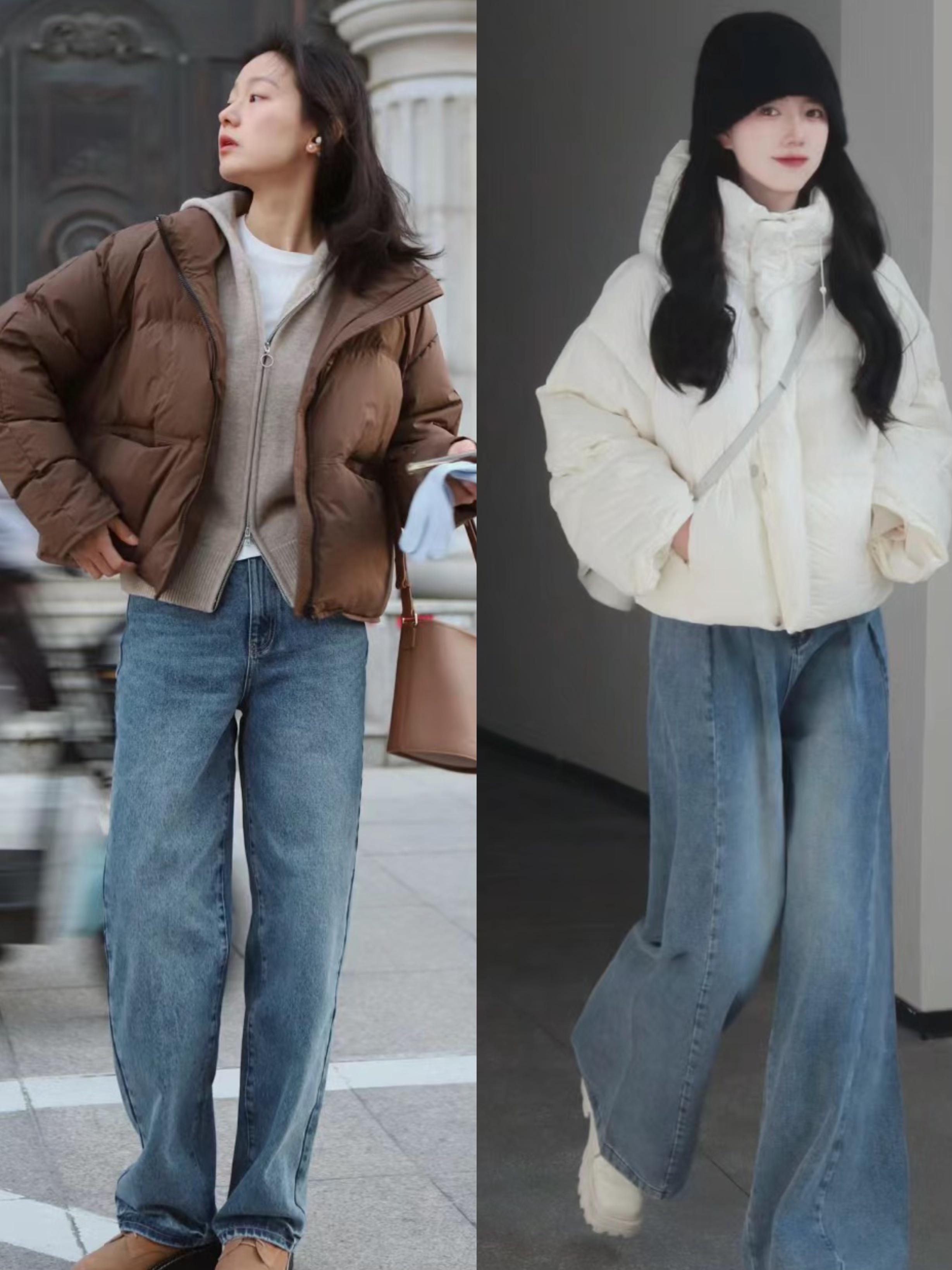 我們穿蓬鬆感比較強的羽絨服,如果想要一種舒適自在的美,可以搭配稍微寬鬆的闊腿牛仔褲。寬鬆的闊腿牛仔褲,對於身體的包容性更強。
