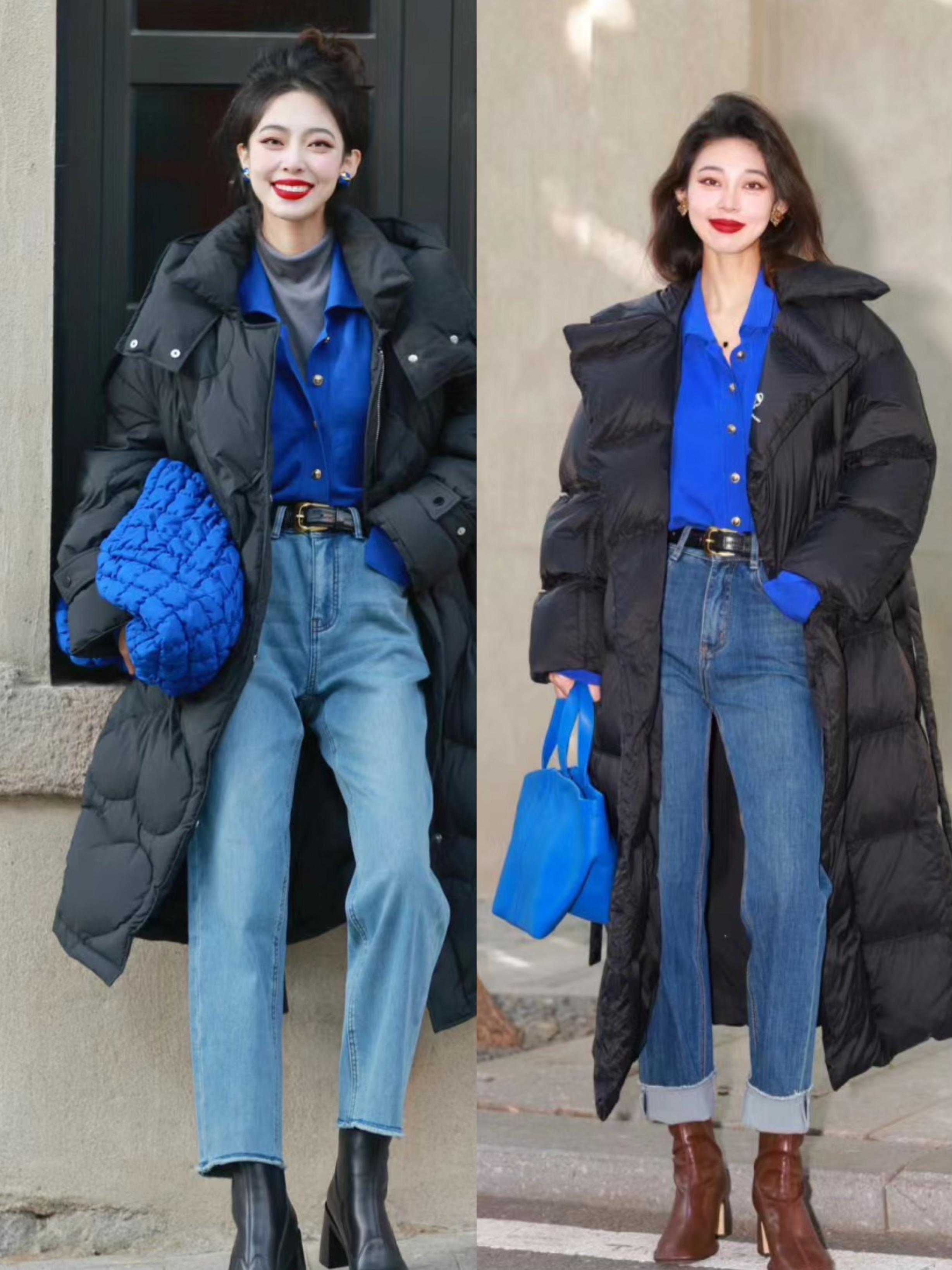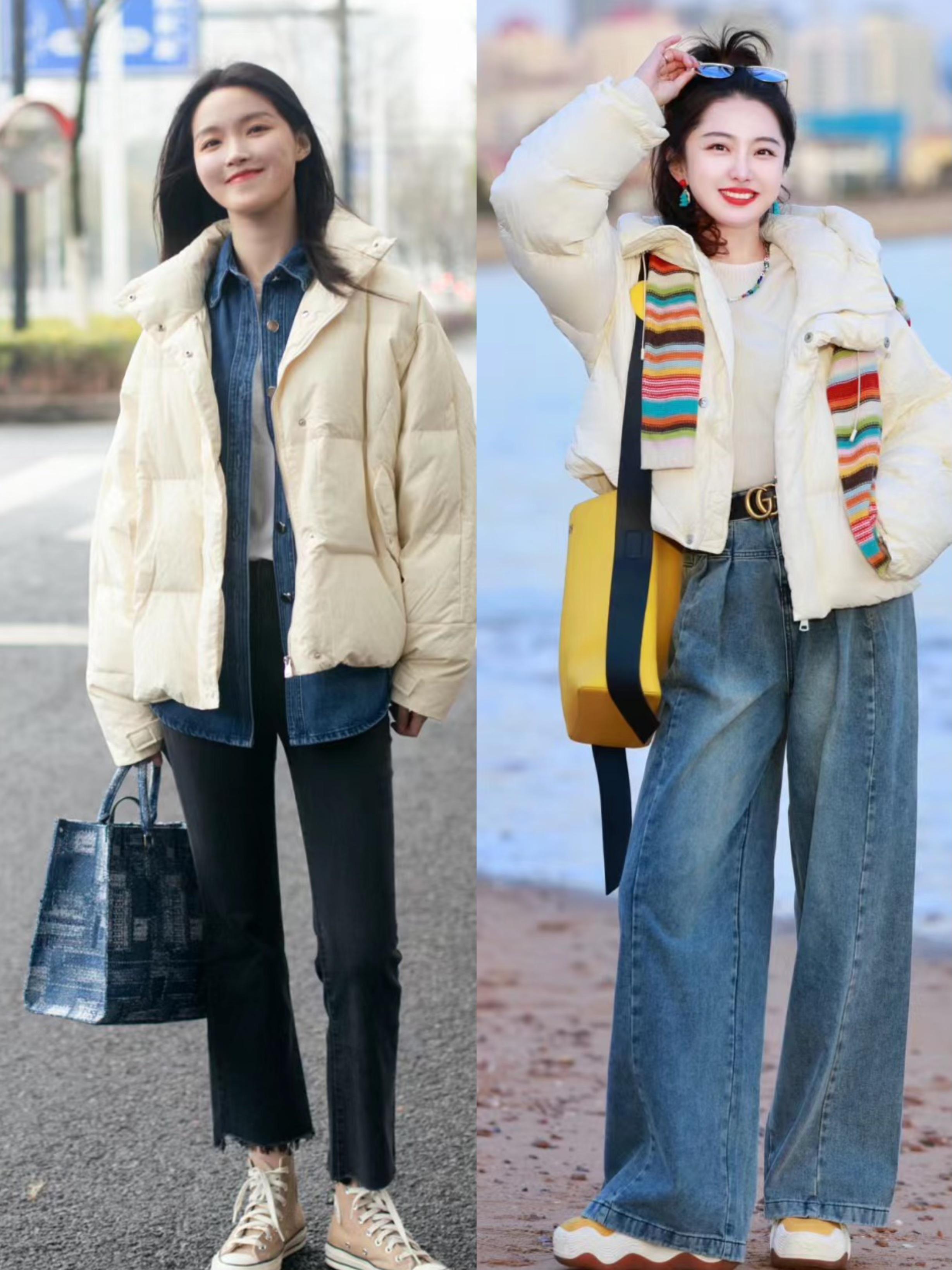 白色羽絨服的清新大方、黑色羽絨服的穩重端莊,都是非常耐看且不挑人的款式。寬鬆一點的羽絨服,可以配修身內搭。搭配經典的藍色牛仔褲、時髦又醒目。