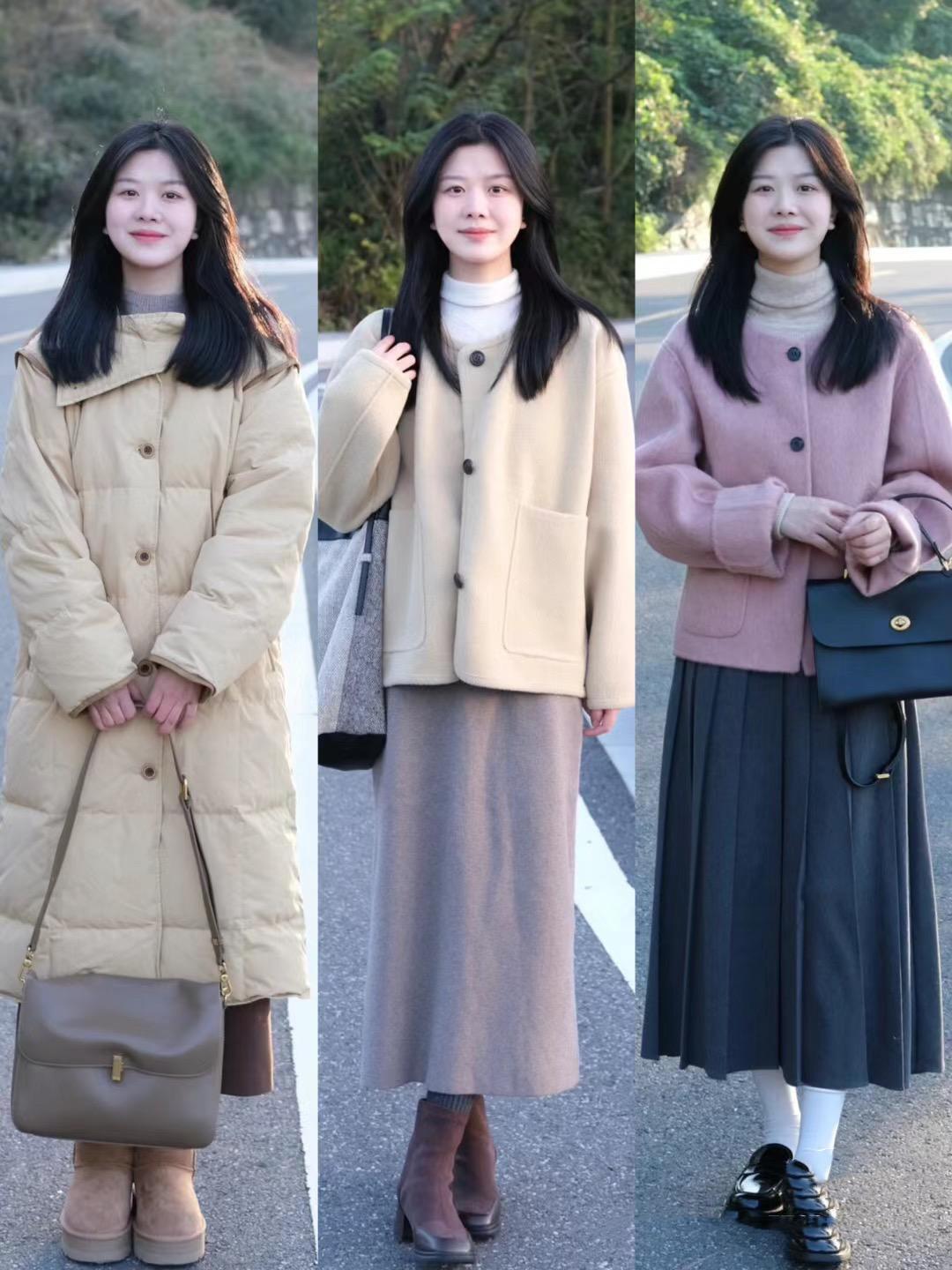 一件絎縫設計的羽絨服,穿起來保暖防風又不會顯得臃腫邋遢。我們可以搭配毛呢半身裙,更多了溫柔的氣質。毛呢半身裙同樣選擇淺色系,氣質上的柔和讓人心動。