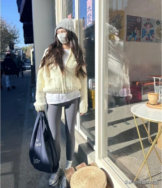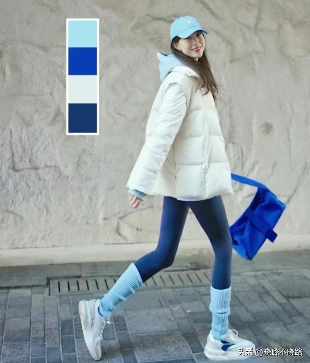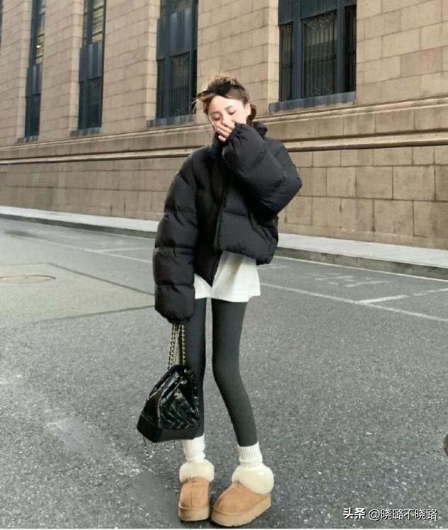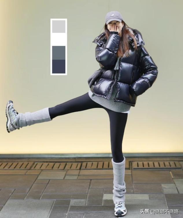 基礎穿搭的配色選擇,黑白會永遠是你保險的基礎,這三種顏色可以層次遞進的運用在一整套羽絨服和無痕褲的造型當中,灰色配長襪,黑色配羽絨服和無痕褲,白色作爲上衣內搭,簡約色彩永遠耐看。