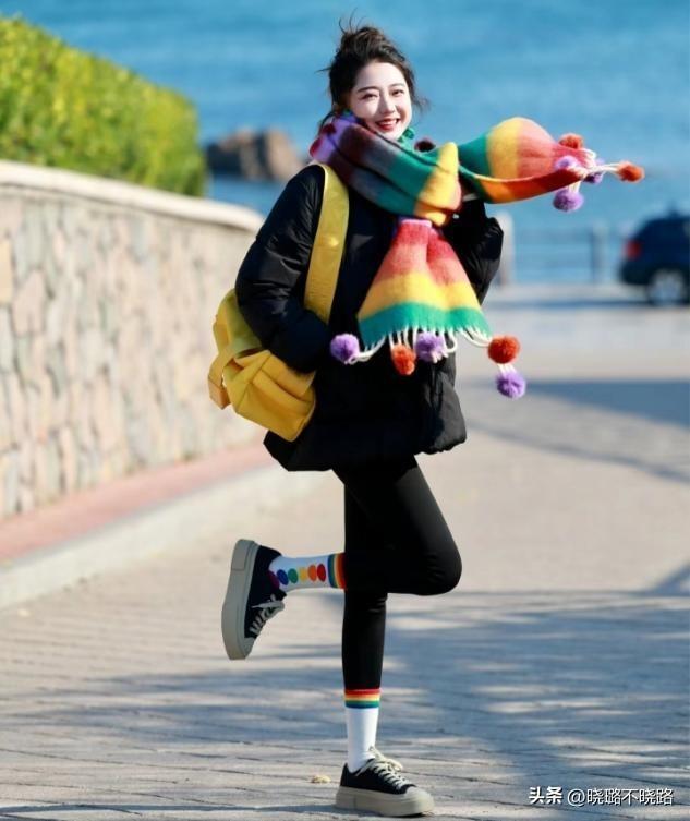 ②帽子和短襪豐富視覺層次,單穿羽絨服不顯單調