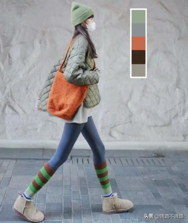 森系風格的組合,用來展示出你造型的活力感,在這裏推薦的是牛油果綠色匹配橙色,綠色系用來點綴棉服和羽絨服,可以大幅度的縮減膨脹感,橙色系用來點綴包包或者是短襪,灰色永遠是無痕褲最好的底色。