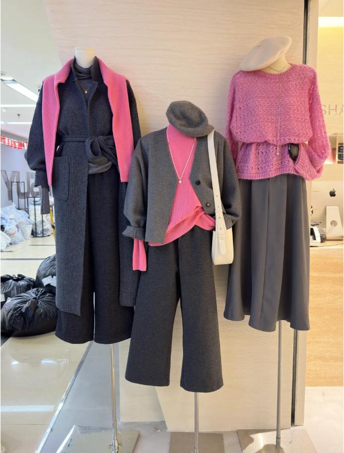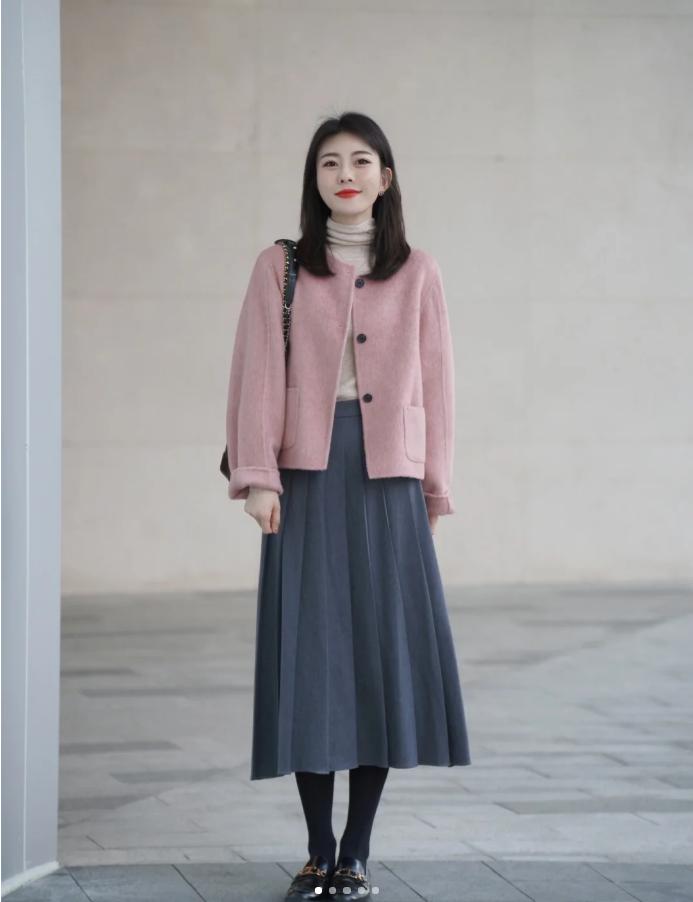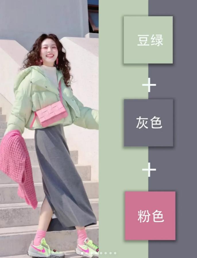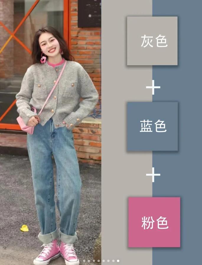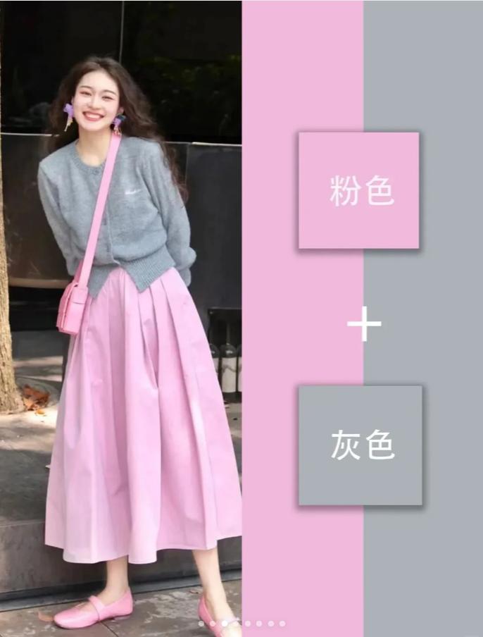 擇一種粉色作爲主色調,灰色作爲輔助色。例如,可以選擇一件灰色針織衫+粉色半身裙,既溫柔又時尚。