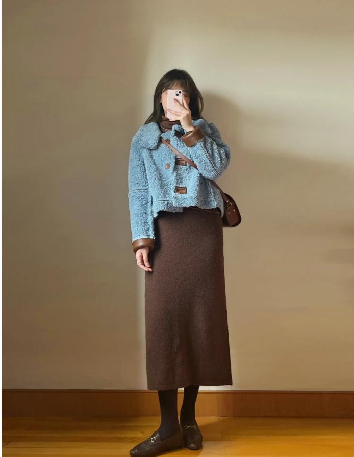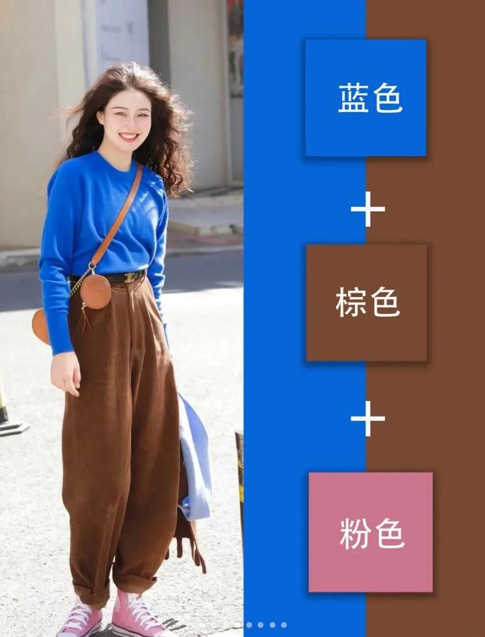 三種撞色組合,復古又高級感滿滿。藍棕配色本身就非常有代表性,想要有點撞色就加入一點粉色,鞋子或者箱包的點綴,更加具有減齡感。