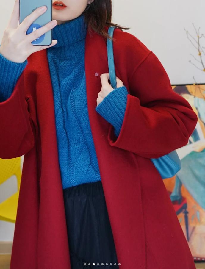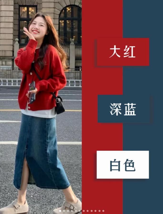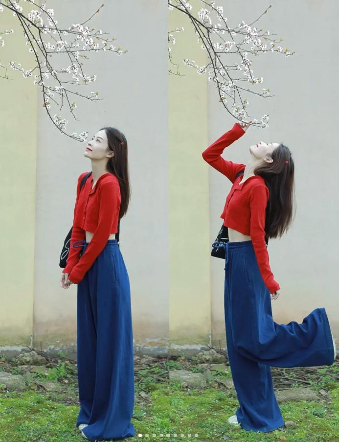 亮眼又顯白,紅色毛衣襯托好氣色,爲整體造型增添活力和熱情,搭配一件深藍色牛仔褲,經典的顏色搭配,既實用又時尚。白色鞋子和白色內搭作爲點綴,爲整體造型增加一絲清新感。