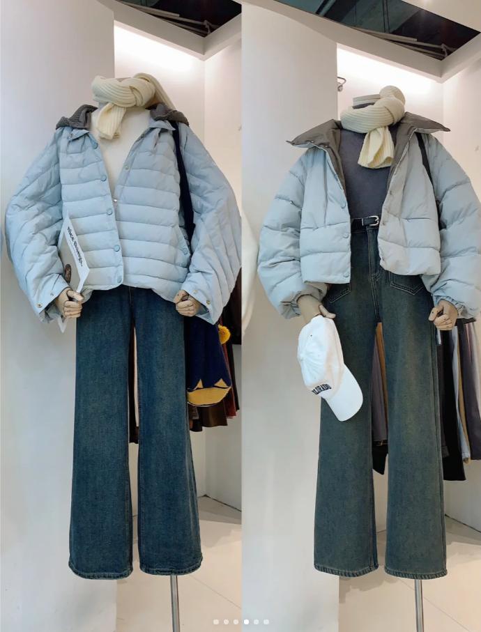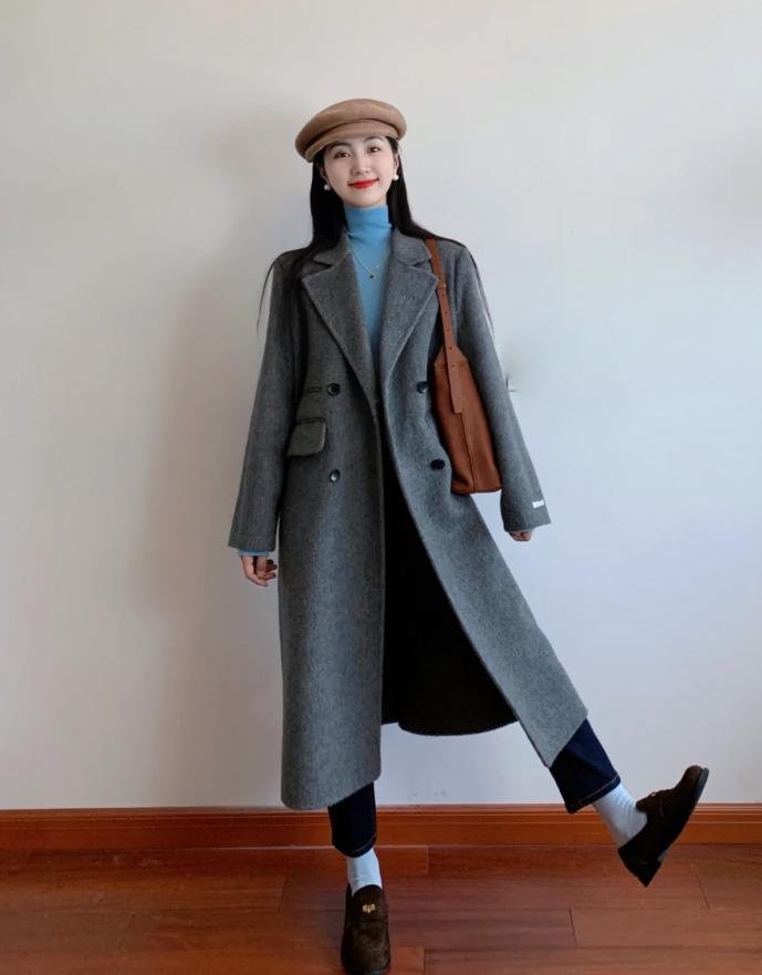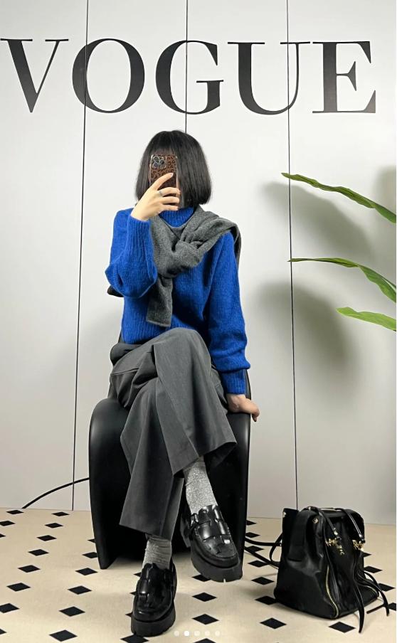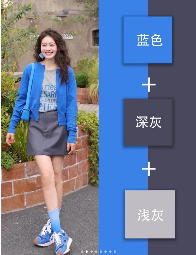 對比色的穿搭,讓整個視覺呈現出跳躍感。藍色和深灰互補,搭配在一起會產生強烈的對比效果,吸引人的注意力。兩種不同灰色之間疊加,也讓整體的搭配更加柔和和易於接受。