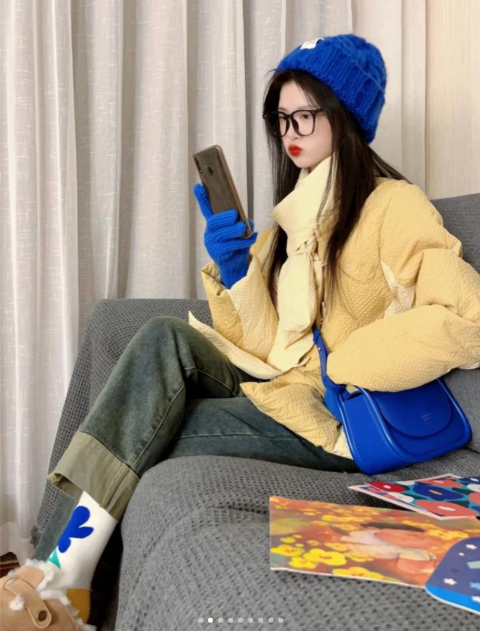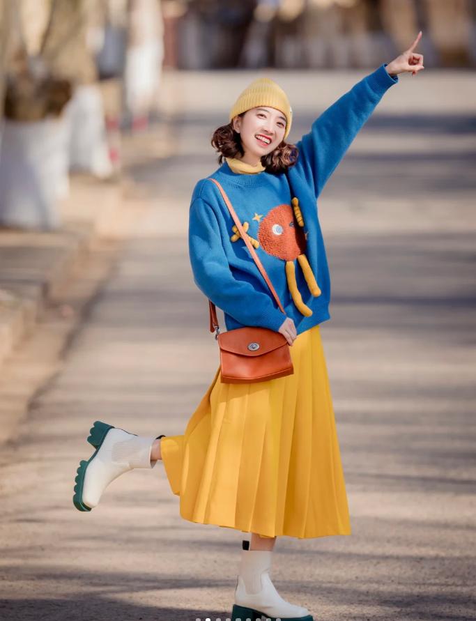 黃色和藍色是一種非常鮮明和活潑的搭配組合,簡單的白色內搭與黃色毛衣疊穿,馬甲也可以。同時,也要注意顏色的明度差異,避免過於刺眼或不協調的搭配。