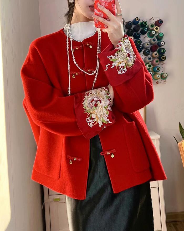 龍年賀歲,去走訪親戚拜年又怎能少了一件紅色的衣服?盤扣+精美刺繡加持,這樣一件新中式外套真的太好看了。質感和麪料非常好,穿起來整個人的氣質都得到提升。