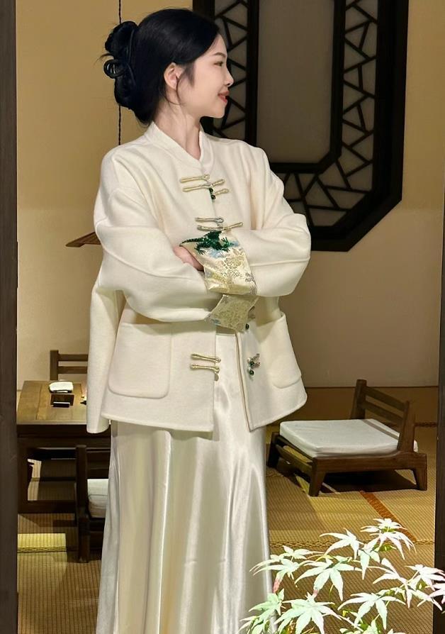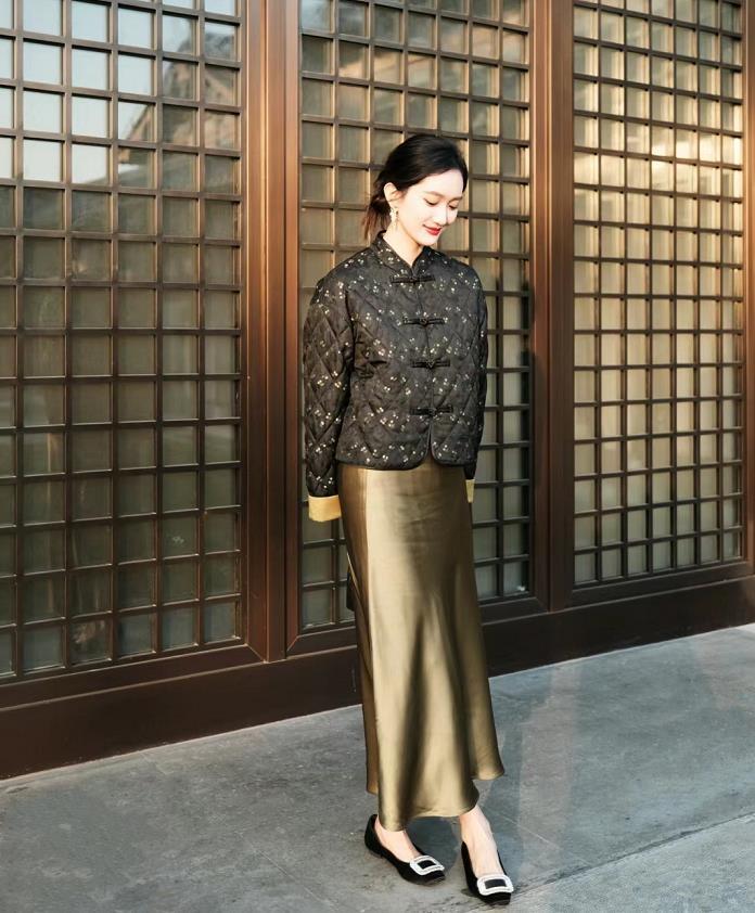 2024最流行什麼樣式的外套呢?新中式的外套了解一下,這款短款的新中式外套,比較適合個矮的姐妹穿。搭配緞面半身長裙,優雅高貴又大方。