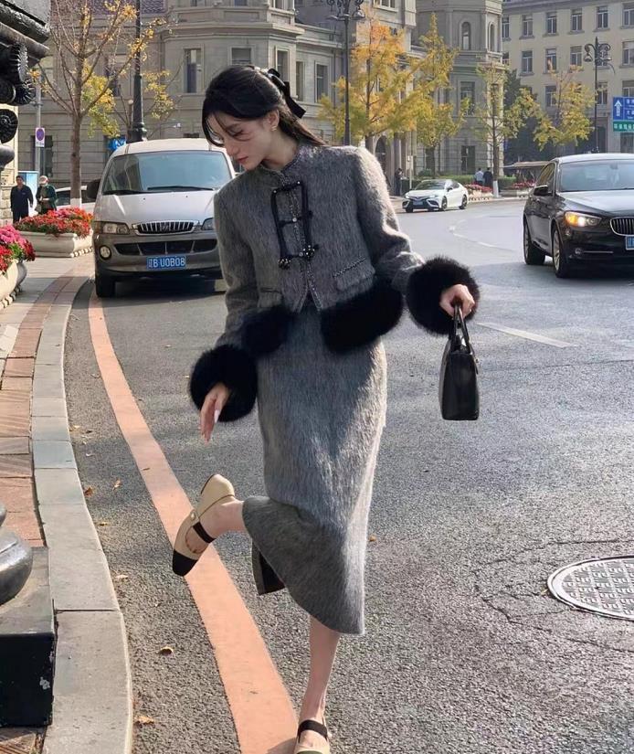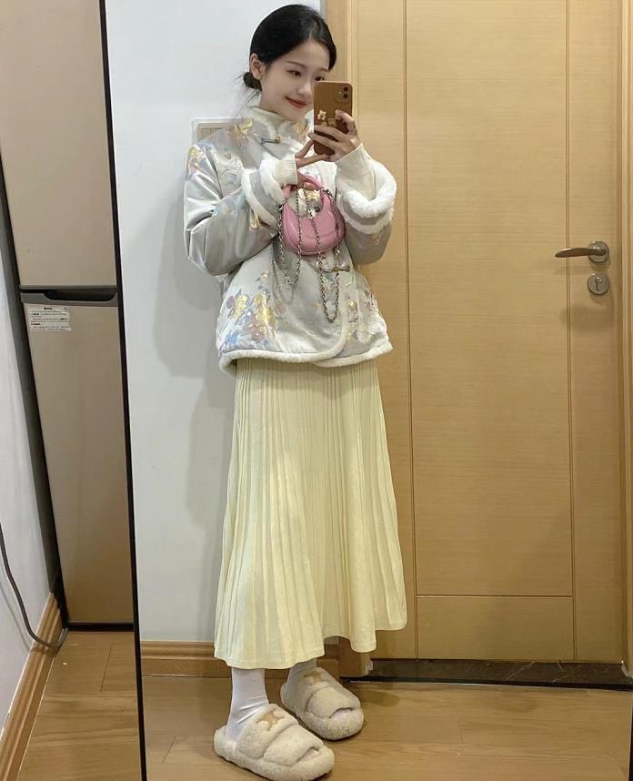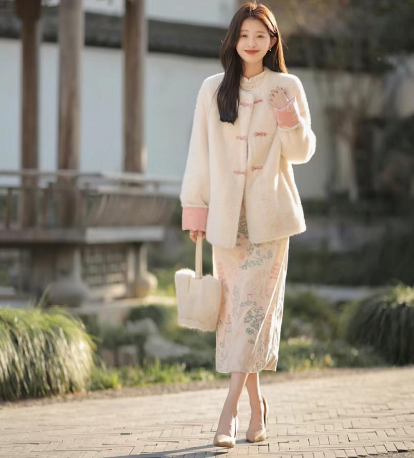 到過年那邊,溫度大概又要下降了,出門拜年走訪親戚,一件溫暖的外套是少不了的。毛毛新中式外套,穿起來就非常暖和。搭配輕盈的半身裙,一薄一厚,頗有對比性。