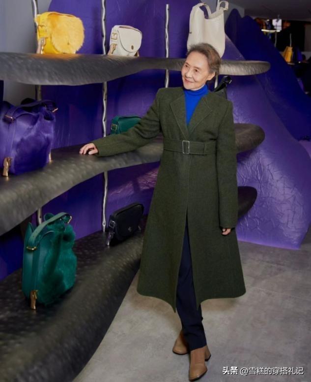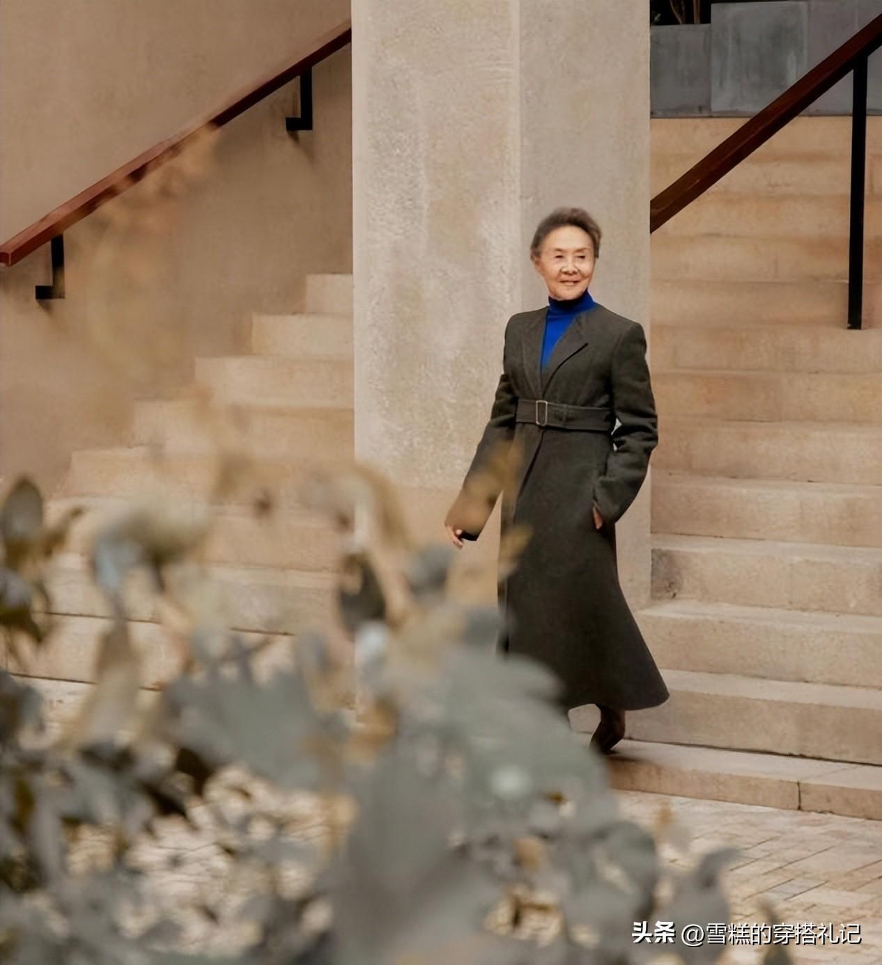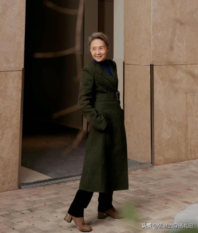外套長度的過膝選擇,能夠維護的是縱向比例的拉扯效果,長款單品的修身穿搭,在大衣外面增加一條腰帶,就很有看點,對比出來的腰臀曲線,讓你到老也有女人味。