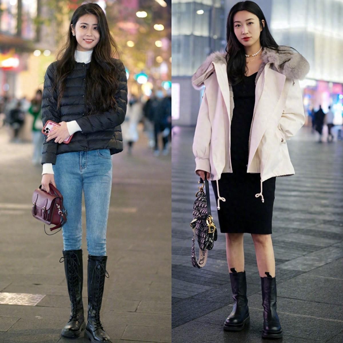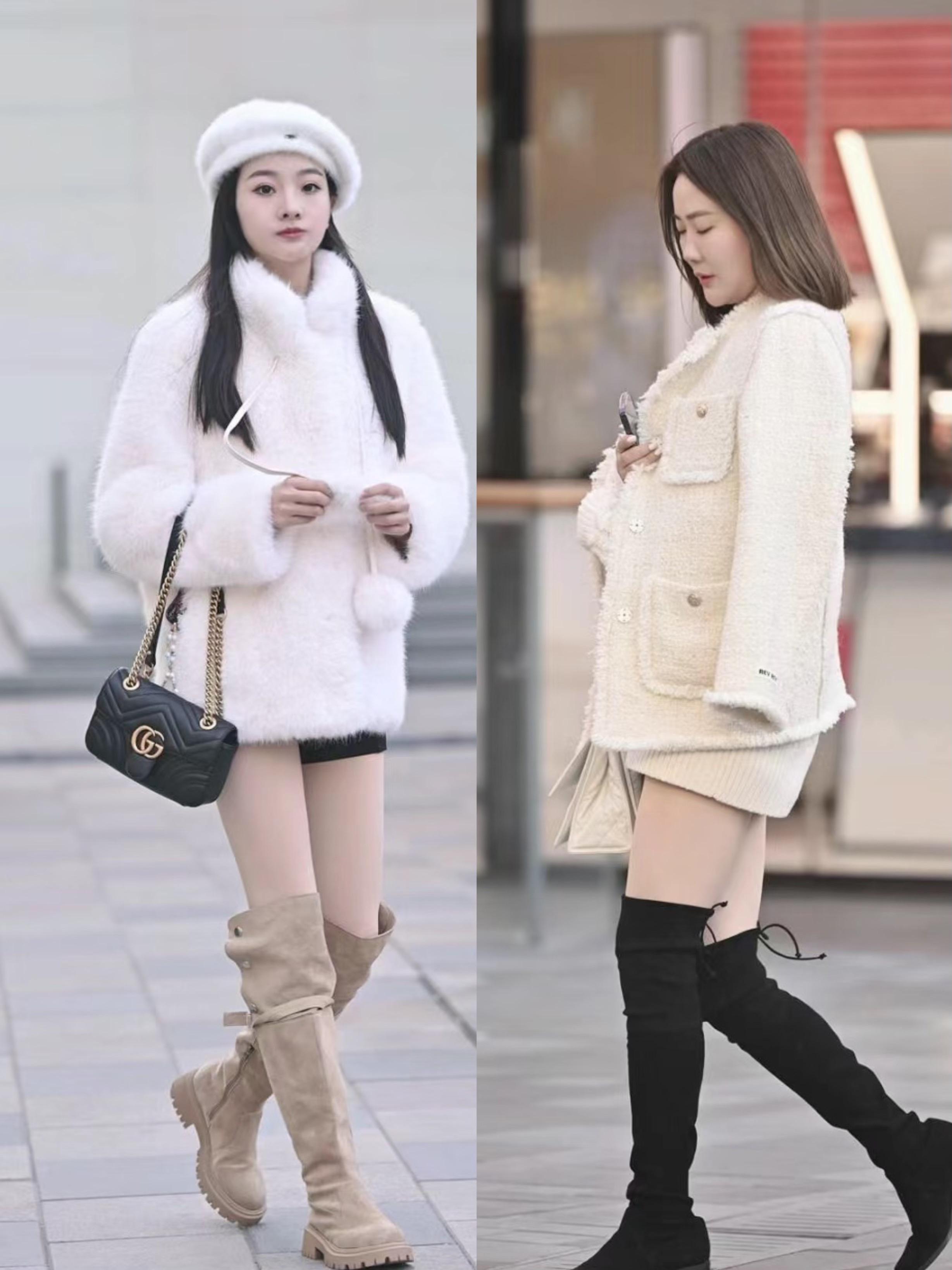 這種過膝長靴+毛絨外套的組合,可以表現出雙腿的挺拔感。光腿神器的融入,不僅更加保暖、也具備了更強的顯瘦效果。光腿神器可以搭配膚感比較真實的款式,會更加耐看一些。