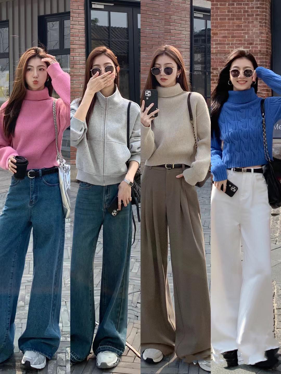 用短款的高領毛衣,來搭配高腰的闊腿褲,有一種更加隨性自然的美。像這種高腰的闊腿褲、版型比較挺闊,保暖性更強。白色高腰闊腿褲,穿起來也更加大方醒目。