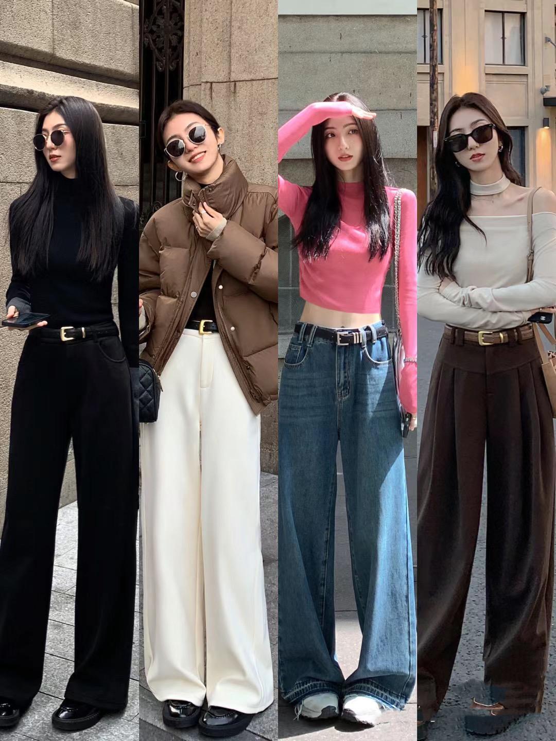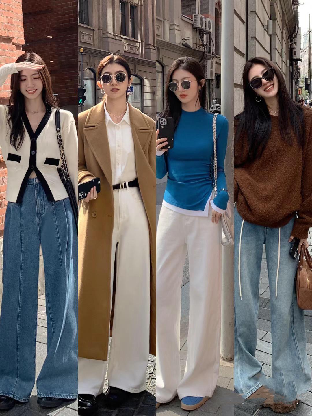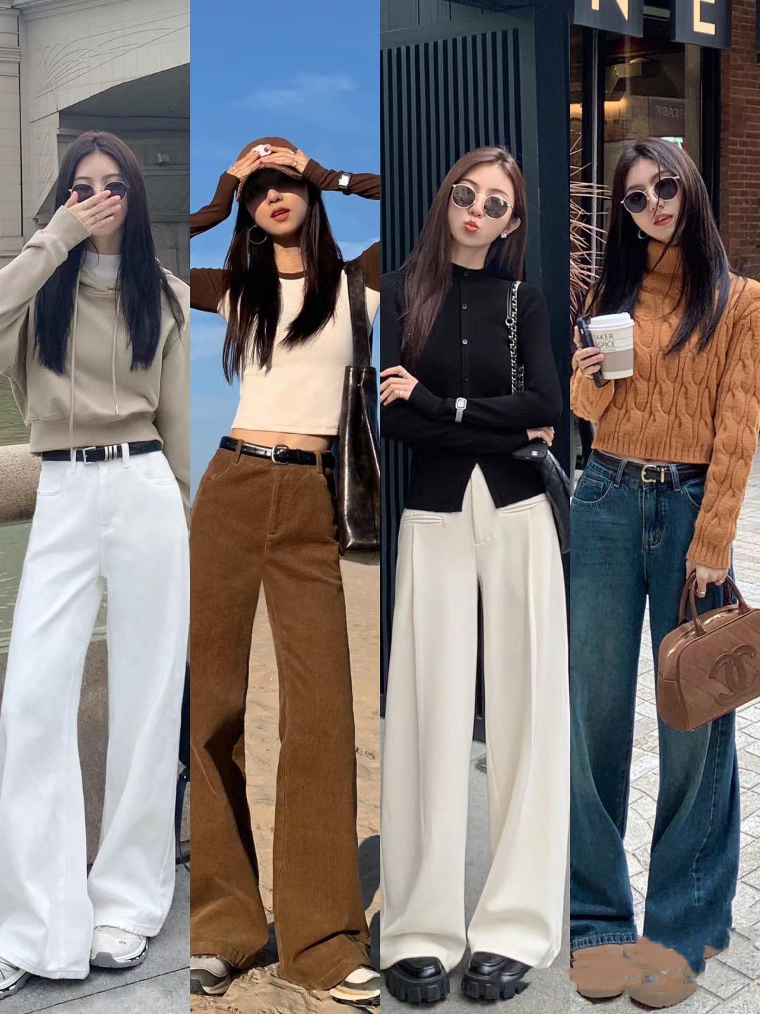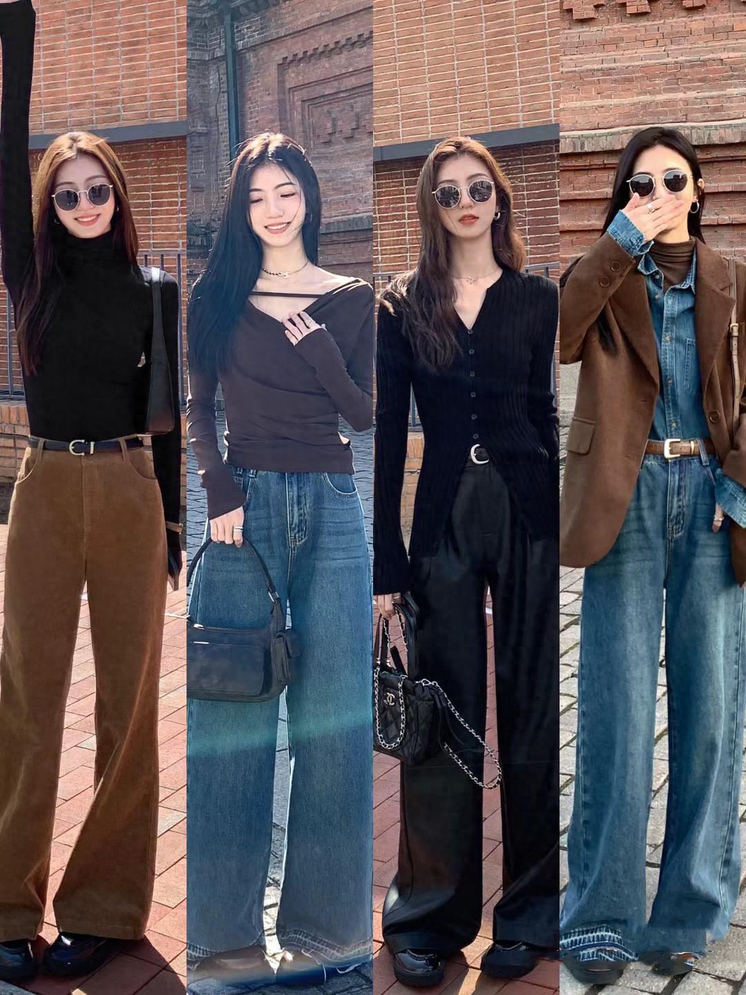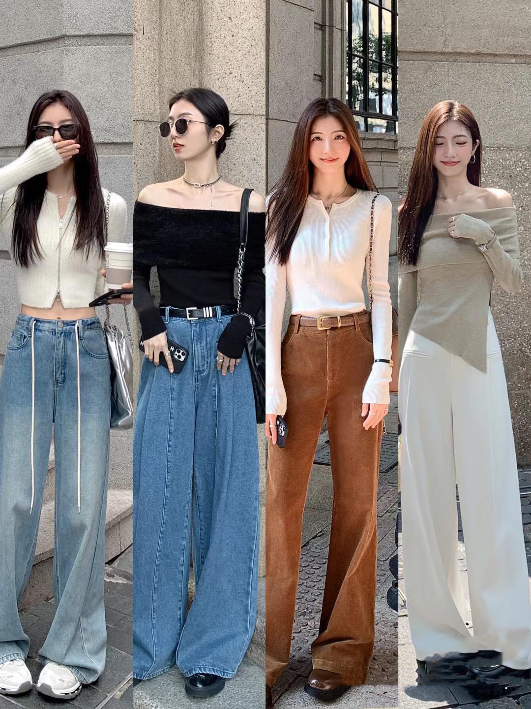 厚實的牛仔闊腿褲,或者雪尼爾、毛呢、燈芯絨的闊腿褲,我們都可以搭配加絨加厚的面料,穿起來垂墜大方、保暖性也會更強一些。