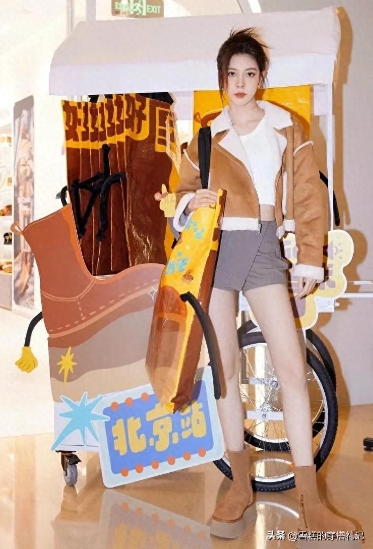 √造型解析:棕色“鉛筆靴”+淺藍色牛仔褲+棕色短絨外套
