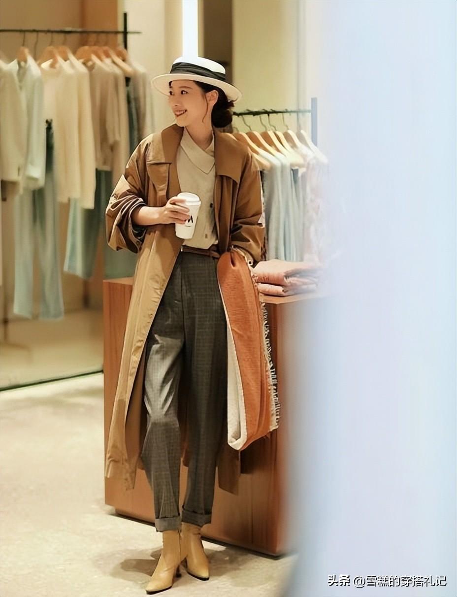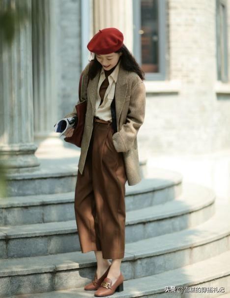奶奶褲本身具有英倫感,可以選擇棕色系的大衣,細節處用圓檐的禮帽點綴,復古感一下子就出來了。