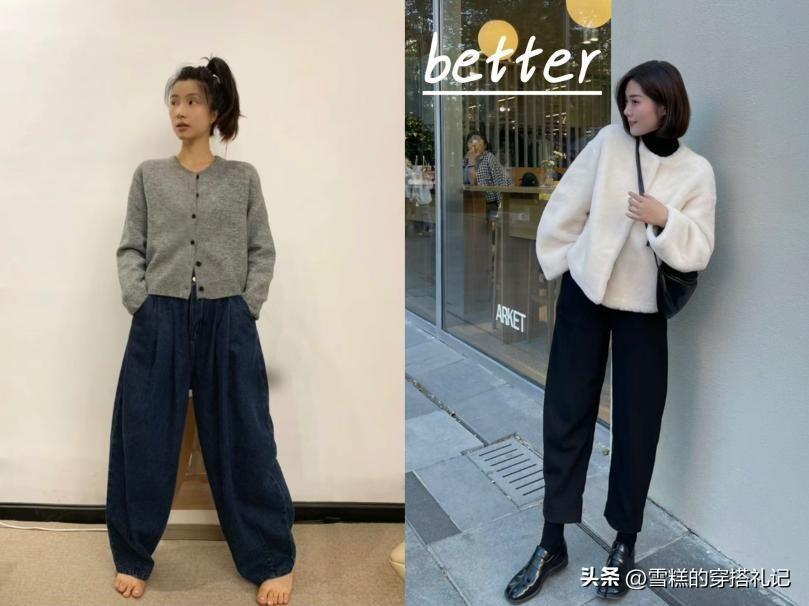 三個奶奶褲的選擇tips,大家在購買的時候可以稍微注意一下,爲什麼奶奶褲不強調拖地褲長呢?這是因爲它上寬下窄的版型決定的,拖地褲長會讓奶奶褲的比例看起來很怪,所以想要顯腿長還是靠高腰設計吧,