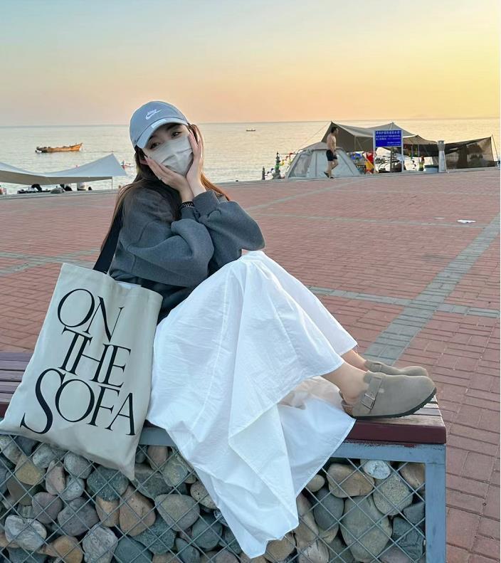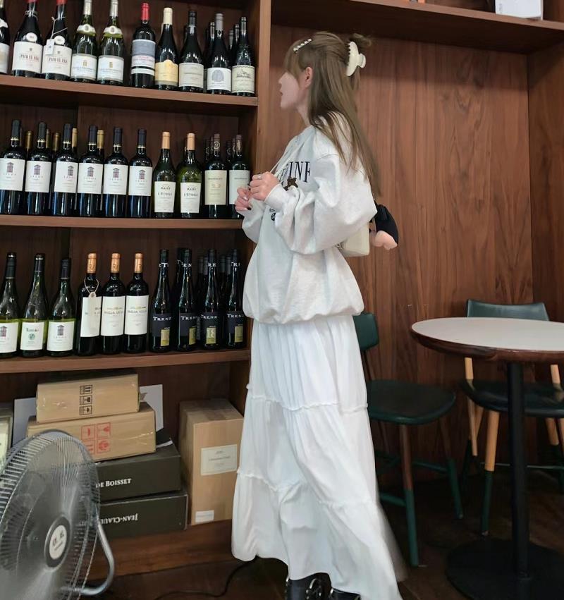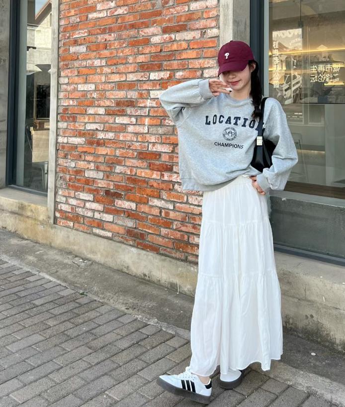 灰色衛衣+白色半身長裙,第一眼就讓人驚豔了,仙氣感十足的半裙,不僅藏肉還顯瘦。出門踩着一雙勃肯鞋,舒適自在又時髦。
