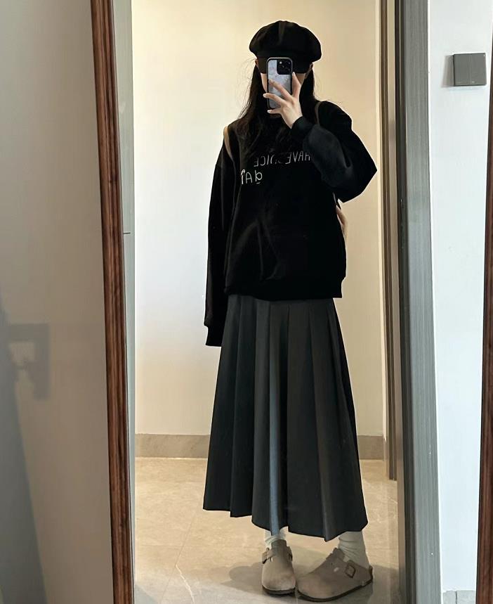 衛衣+百褶半裙纔是最愛,黑色和灰色都是基礎色,搭配在一起自然是沒有問題的,大百褶的裙襬,遮肉顯瘦。