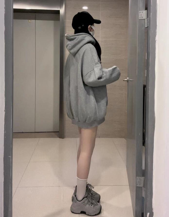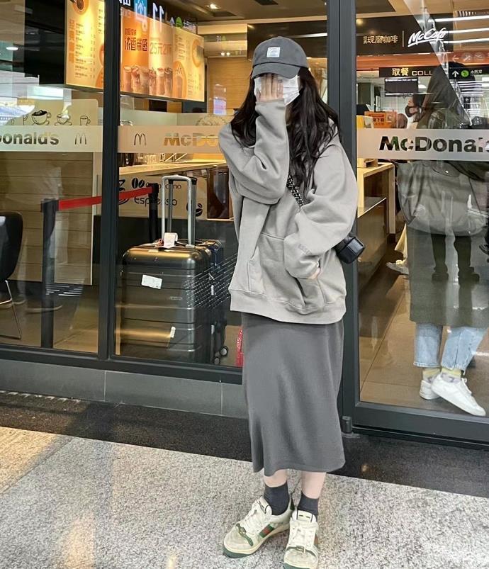 不懂配色的姐妹,在穿搭上多選擇套裝,或者是同色系的搭配就對了,同色系的搭配更顯時髦和高級。淺灰連帽衛衣+灰色半身長裙+運動鞋,滿滿休閒感又青春的搭配。