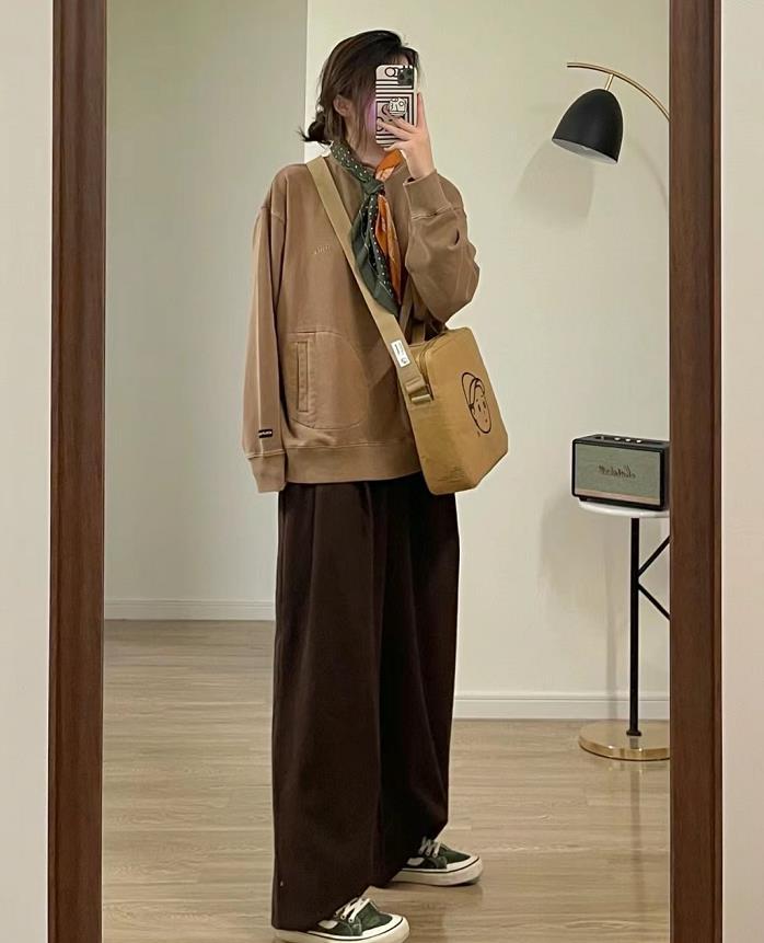 卡其色圓領衛衣+絲巾,下身選的褲子也是深咖色的,這些顏色組合在一起復古範十足。寬鬆的闊腿褲,鬆弛感十足,也顯瘦舒適,更能將腿部的缺點隱藏起來。
