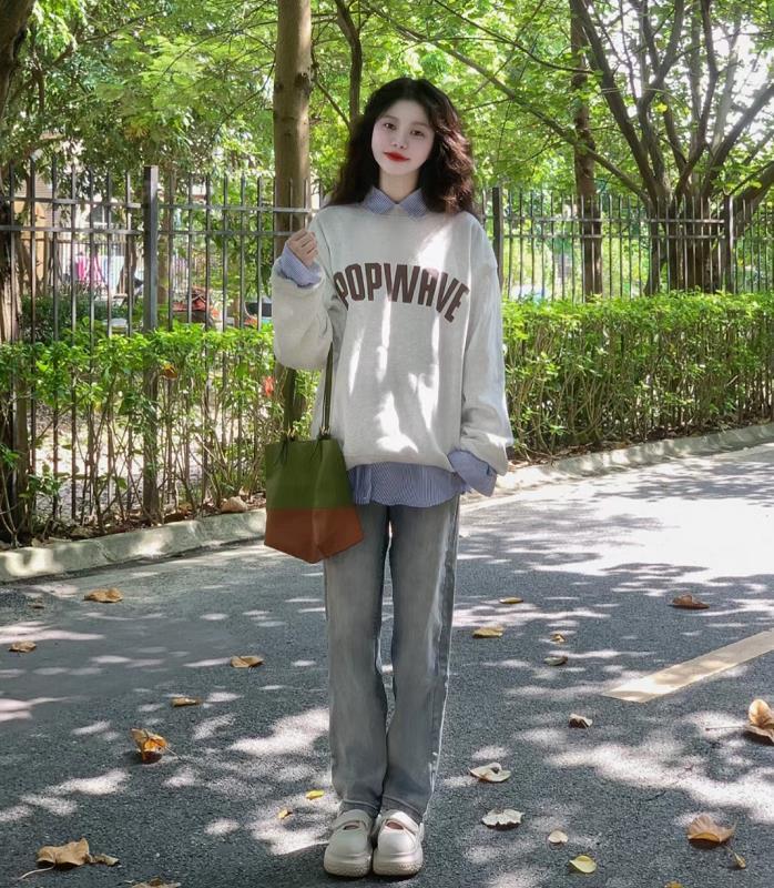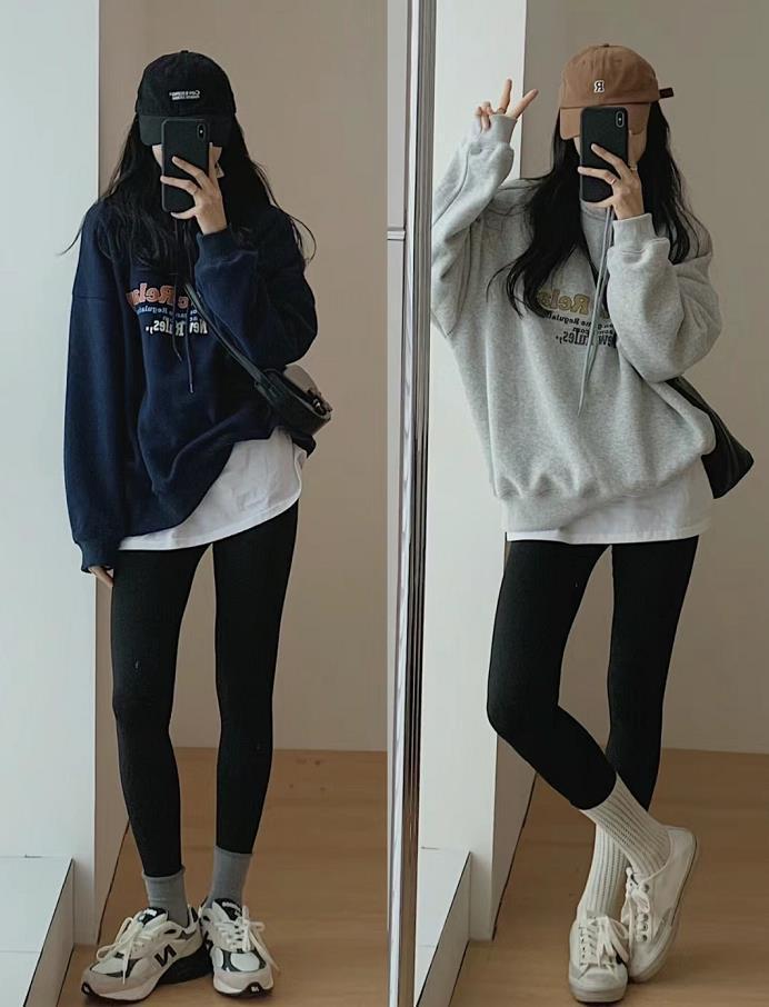 韓系範滿滿的一套,簡約舒服慵懶,灰色基礎衛衣裏面疊穿白色長袖t恤,記得露出裏面的t恤,這樣才能打造出層次感。